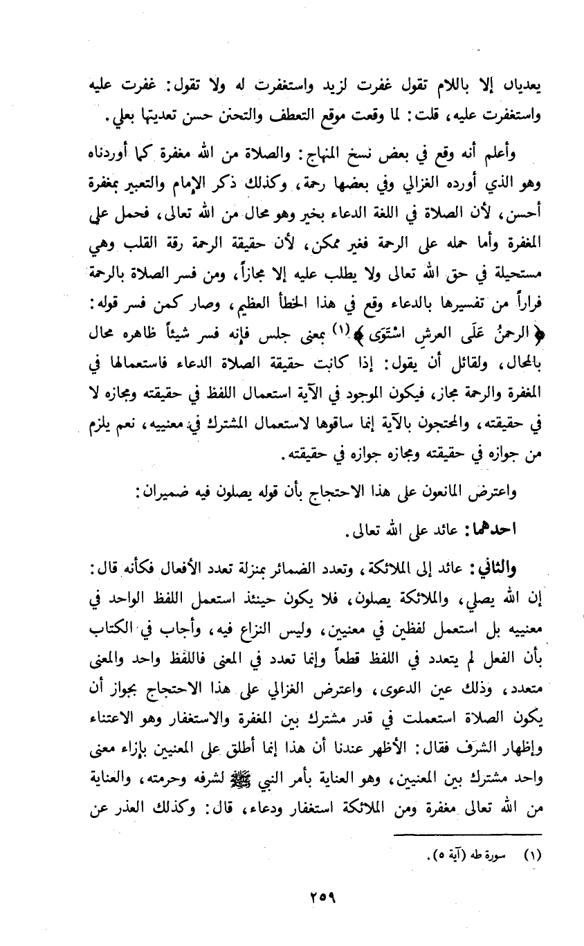 والثاني: عائد إلى الملائكة وتعدد الضمائر بمنزلة تعدد الأفعال فكأنه قال إن الله يصلي والملائكة يصلون فلا يكون حينئذ استعمل اللفظ الواحد في معنييه بل استعمل لفظين في معنيين وليس النزاع فيه وأجاب في الكتاب بأن الفعل لم يتعدد في اللفظ قطعا وإنما تعدد في المعنى فاللفظ واحد والمعنى متعدد وذلك عين الدعوى واعترض الغزالي على هذا الاحتجاج بجواز أن يكون الصلاة استعملت في قدر مشترك بين المغفرة والاستغفار وهو الاعتناء وإظهار الشرف فقال الأظهر عندنا أن هذا إنما أطلق على المعنيين بإزاء معنى واحد مشترك بين المعنيين وهو العناية بأمر النبي صلى الله عليه وسلم لشرفه وحرمته والعناية من الله تعالى مغفرة ومن الملائكة استغفار ودعاء قال وكذلك العذر عن