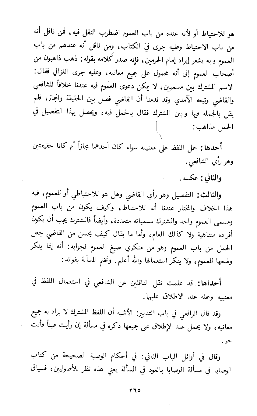 والثالث: التفصيل وهو رأي القاضي وهل هو للاحتياطي أو للعموم فيه هذا الخلاف والمختار عندنا أنه للاحتياط وكيف يكون من باب العموم ومسمى العموم واحد والمشترك مسمياته متعددة وأيضا فالمشترك يجب أن يكون أفراده متناهية ولا كذلك العام وأما ما يقال كيف يحسن من القاضي جعل الحمل من باب العموم وهو من منكري صيغ العموم فجوابه أنه إنما ينكر وضعها للعموم ولا ينكر استعمالها والله أعلم ونختم المسألة بفوائد: