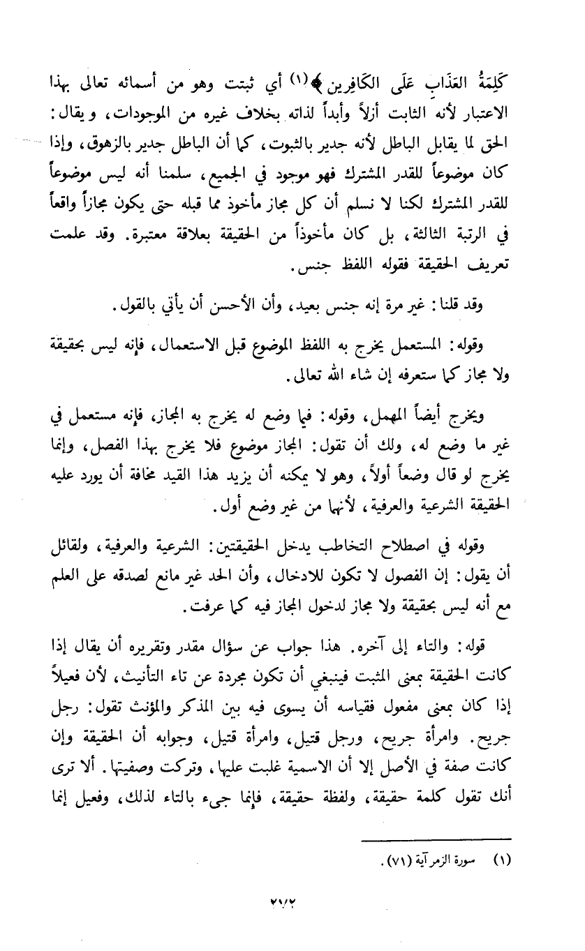كَلِمَةُ الْعَذَابِ عَلَى الْكَافِرِينَ} ١ أي ثبتت وهو من أسمائه تعالى بهذا الاعتبار لأن الثابت أزلا وأبدا لذاته بخلاف غيره من الموجودات ويقال الحق لما يقابل الباطل لأنه جدير بالثبوت كما أن الباطل جدير بالزهوق وإذا كان موضوعا للقدر المشترك فهو موجود في الجميع سلمنا أنه ليس موضوعا للقدر المشترك لكنا لا نسلم أن كل مجاز مأخوذ مما قبله حتى يكون مجازا واقعا في الرتبة الثالثة بل كان مأخوذا من الحقيقة بعلاقة معتبرة وقد علمت تعريف الحقيقة فقوله اللفظ جنس.