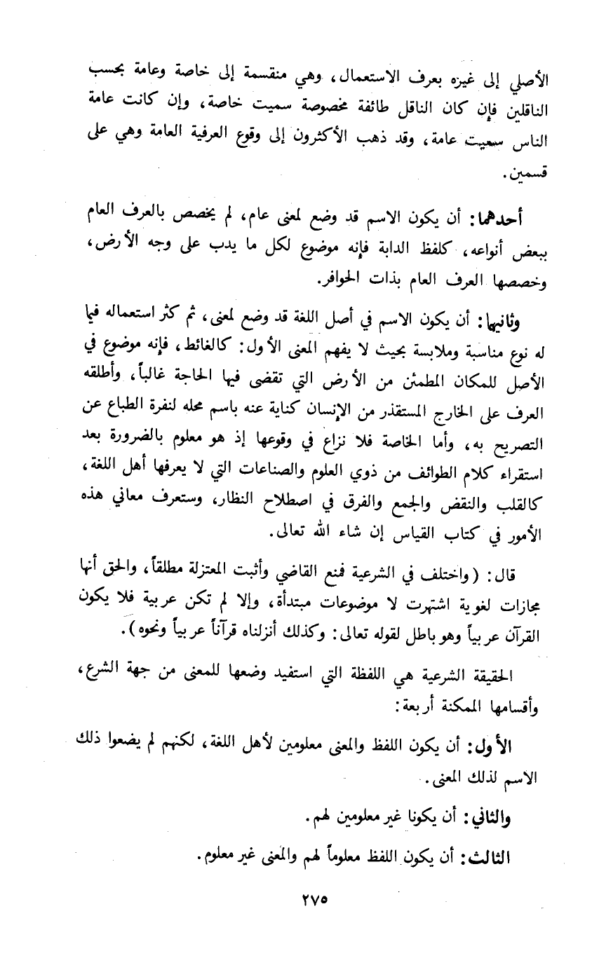 وثانيهما: أن يكون الاسم في أصل اللغة قد وضع لمعنى ثم كثر استعماله فيما له نوع مناسبة وملابسة بحيث لا يفهم المعنى الأول كالغائط فإنه موضوع في الأصل للمكان المطمئن من الأرض التي تقضى فيها الحاجة غالبا وأطلقه العرف على الخارج المستقذر من الإنسان كناية عنه باسم محله لنفرة الطباع عن التصريح به وأما الخاصة فلا نزاع في وقوعها إذ هو معلوم بالضرورة بعد استقراء كلام الطوائف من ذوي العلوم والصناعات التي لا يعرفها أهل اللغة كالقلب والنقض والجمع والفرق في اصطلاح النظار وستعرف معاني هذه الأمور في كتاب القياس إن شاء الله تعالى.