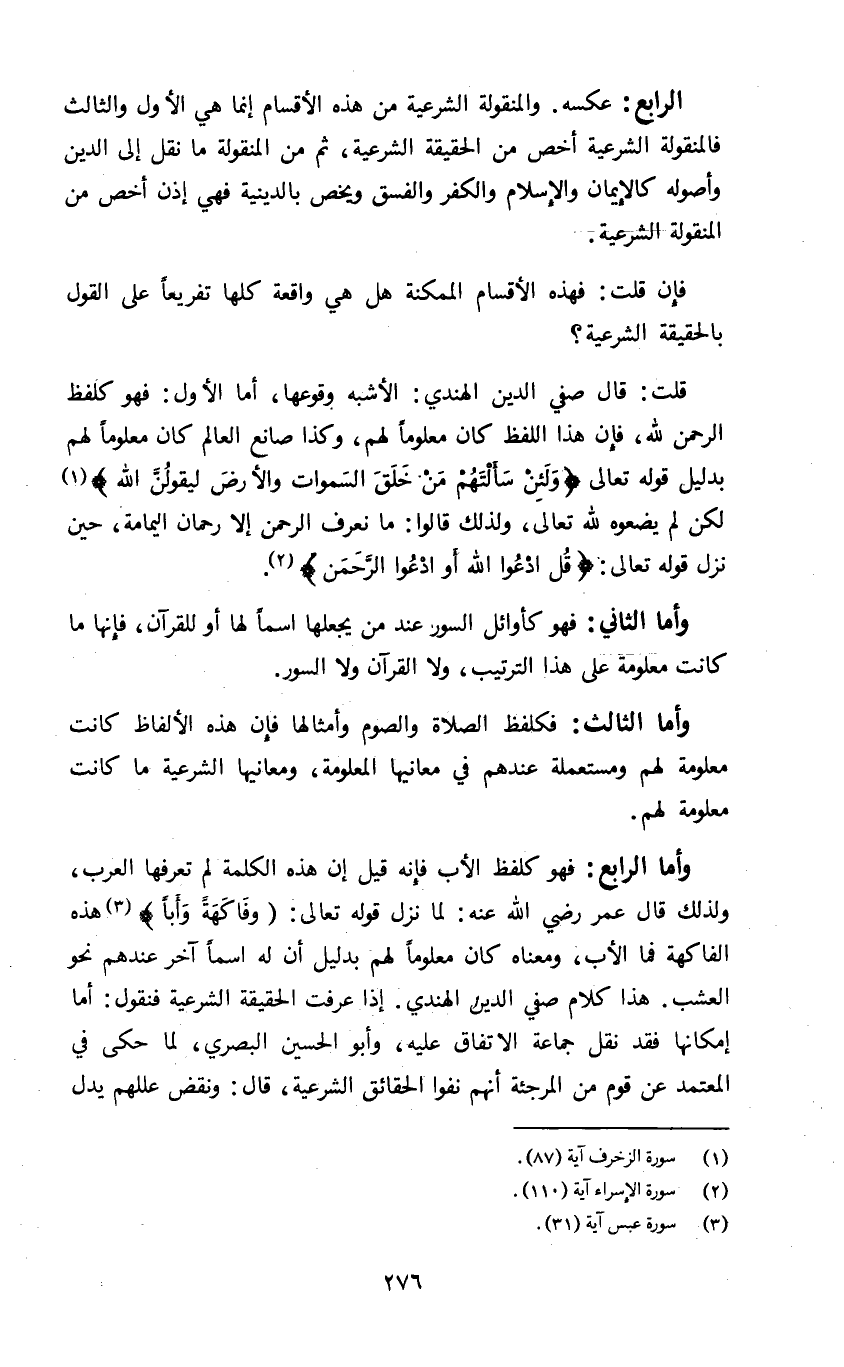وأما الرابع: فهو كلفظ الأب فإنه قيل إن هذه الكلمة لم تعرفها العرب ولذلك قال عمر رضي الله عنه لما نزل قوله تعالى: {وَفَاكِهَةً وَأَبّاً} ٣ هذه الفاكهة فما الأب ومعناه كان معلوما لهم بدليل أن له اسما آخر عندهم نحو العشب هذا كلام صفي الدين الهندي إذا عرفت الحقيقة الشرعية فنقول أما إمكانها فقد نقل جماعة الاتفاق عليه وأبو الحسين البصري لما حكى في المعتمد عن قوم من المرجئة أنهم نفوا الحقائق الشرعية قال ونقض عللهم يدل