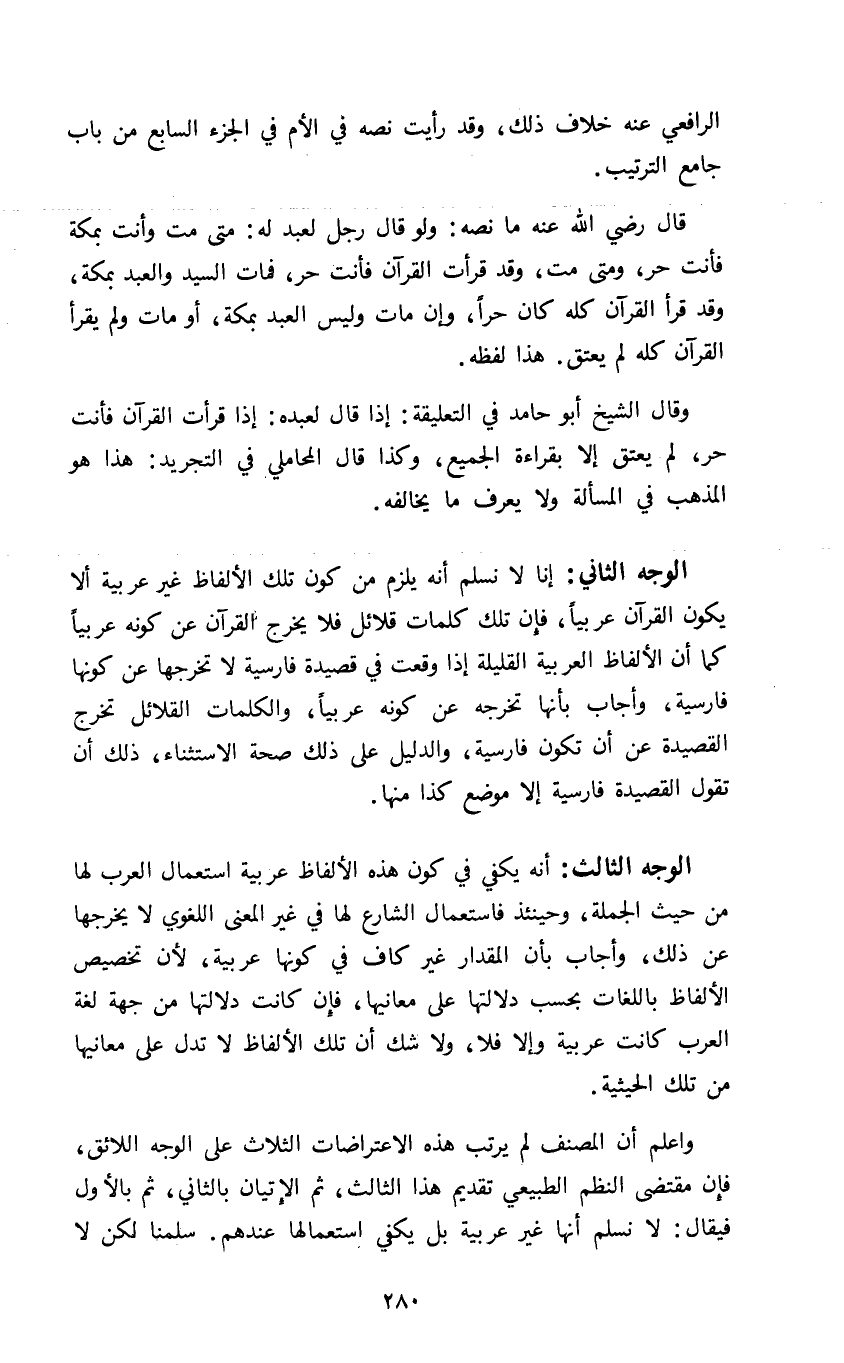 الوجه الثاني: إنا لا نسلم أنه يلزم من كون تلك الألفاظ غير عربية ألا يكون القرآن عربيا فإن تلك كلمات قلائل فلا يخرج القرآن عن كونه عربيا كما أن الألفاظ العربية القليلة إذا وقعت في قصيد فارسية لا تخرجها عن كونها فارسية وأجاب بأنها تخرجه عن كونه عربيا والكلمات القلائل تخرج القصيدة عن أن تكون فارسية والدليل على ذلك صحة الاستثناء ذلك أن تقول القصيدة فارسية إلا موضع كذا منها.