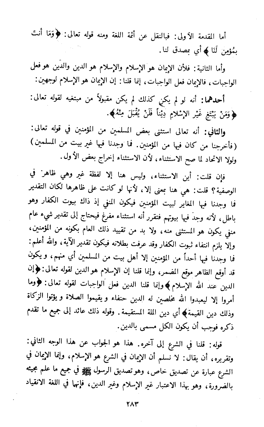 فإن قلت أين الإستثناء وليس هنا إلا لفظة غير وهي ظاهر في الوصفية قلت هي هنا بمعنى إلا لأنه لو كانت على ظاهرها لكان التقدير فما وجدنا فيها المغاير لبيت المؤمنين أنه فيكون المنفي إذ ذاك بيوت الكفار وهو باطل لأنه وجد فيها بيوتهم فتقرر أنه استثناء مفرغ فيحتاج إلى تقدير شيء عام منفي يكون هو المسنثنى منه ولا بد من تقيد ذلك العام بكونه من المؤمنين وإلا يلزم انتفاء ثبوت الكفار وقد عرفت بطلانه فيكون تقدير الآية والله أعلم فما وجدنا فيها أحدا من المؤمنين إلا أهل بيت من المسلمين أي منهم ويكون قد أوقع الظاهر موقع المضمر وإنما قلنا الدين إن الإسلام هو الدين لقوله تعالى: {إِنَّ الدِّينَ عِنْدَ اللَّهِ الْأِسْلامُ} وإنما قلنا الدين فعل الواجبات لقوله تعالى: {وَمَا أُمِرُوا إِلَّا لِيَعْبُدُوا اللَّهَ مُخْلِصِينَ لَهُ الدِّينَ حُنَفَاءَ وَيُقِيمُوا الصَّلاةَ وَيُؤْتُوا الزَّكَاةَ وَذَلِكَ دِينُ الْقَيِّمَةِ} أي دين الملة المستقيمة وقوله ذلك عائد إلى جميع ما تقدم ذكره فوجب أن يكون الكل مسمى بالدين.