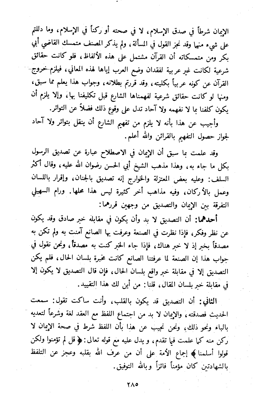 أحدهما: أن التصديق لا بد وأن يكون في مقابله خبر صادق وقد يكون عن نظر وفكر فإذا نظرت في الصنعة وعرفت بها الصانع آمنت به لم تكن به مصدقا بخبر إذ لا خبر هناك فإذا جاء الخبر كنت به مصدقا ونحن نقول في جواب هذا إن الصنعة لما عرفتنا الصانع كانت مخبرة بلسان الحال فلم يكن التصديق إلا في مقابلة خبر واقع بلسان الحال فإن قال التصديق لا يكون إلا في مقابلة خبر بلسان المقال قلنا من أين لك هذا التقييد.