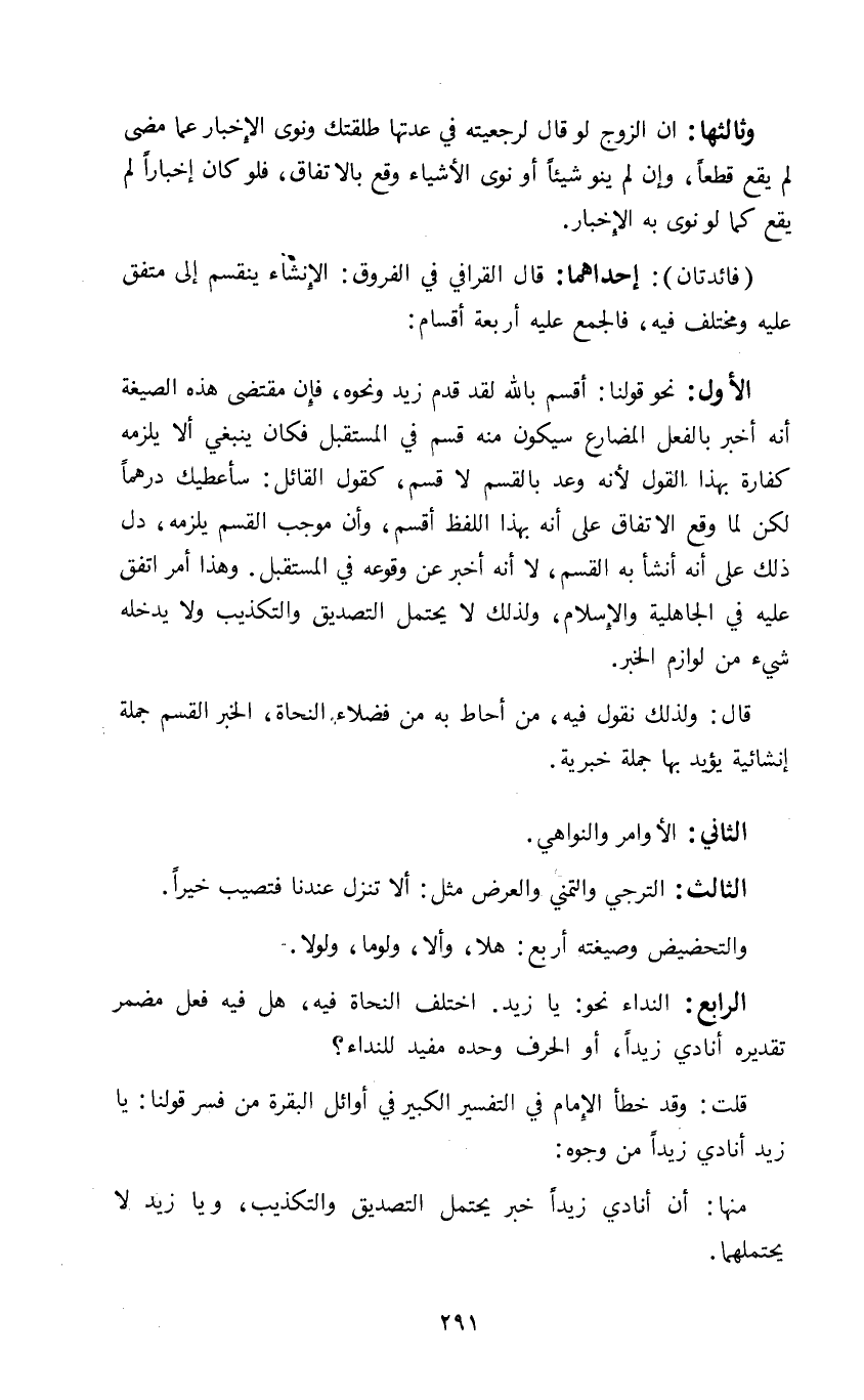 فائدتان إحداهما: قال القرافي في الفروق الإنشاء ينقسم إلى متفق عليه ومختلف فيه فالجمع عليه أربعة أقسام: