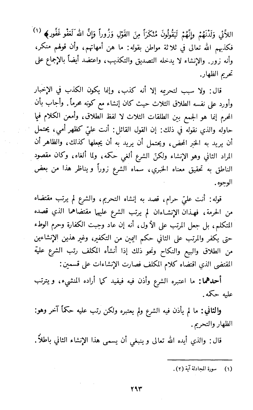 قال ولا سبب لتحريمه إلا انه كذب وإنما يكون الكذب في الإخبار وأورد على نفسه الطلاق الثلاث حيث كان إنشاء مع كونه محرما وأجاب بأن المحرم إنما هو الجمع بين الطلقات الثلاث لا لفظ الطلاق وأمعن الكلام فيما حاوله والذي نقوله في ذلك إن القول القائل أنت علي كظهر أمي يحتمل أن يريد به الخبر المحض ويحتمل أن يريد به أن يجعلها كذلك والظاهر أن المراد الثاني وهو الإنشاء ولكن الشرع ألغي حكمه ولما ألغاه وكان مقصود الناطق به تحقيق معناه الخبري سماه الشرع زورا ويناظر هذا من بعض الوجوه.