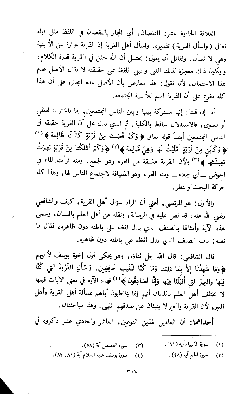 والأول: هو المرتضى أعني أن المراد سؤال أهل القرية كيف والشافعي رضي الله عنه قد نص عليه في الرسالة ونقله عن أهل العلم باللسان وسمى هذه الآية وأمثالها بالصنف الذي يدل لفظه على باطنه دون ظاهره فقال ما نصه باب الصنف الذي يدل لفظه على باطنه دون ظاهره.