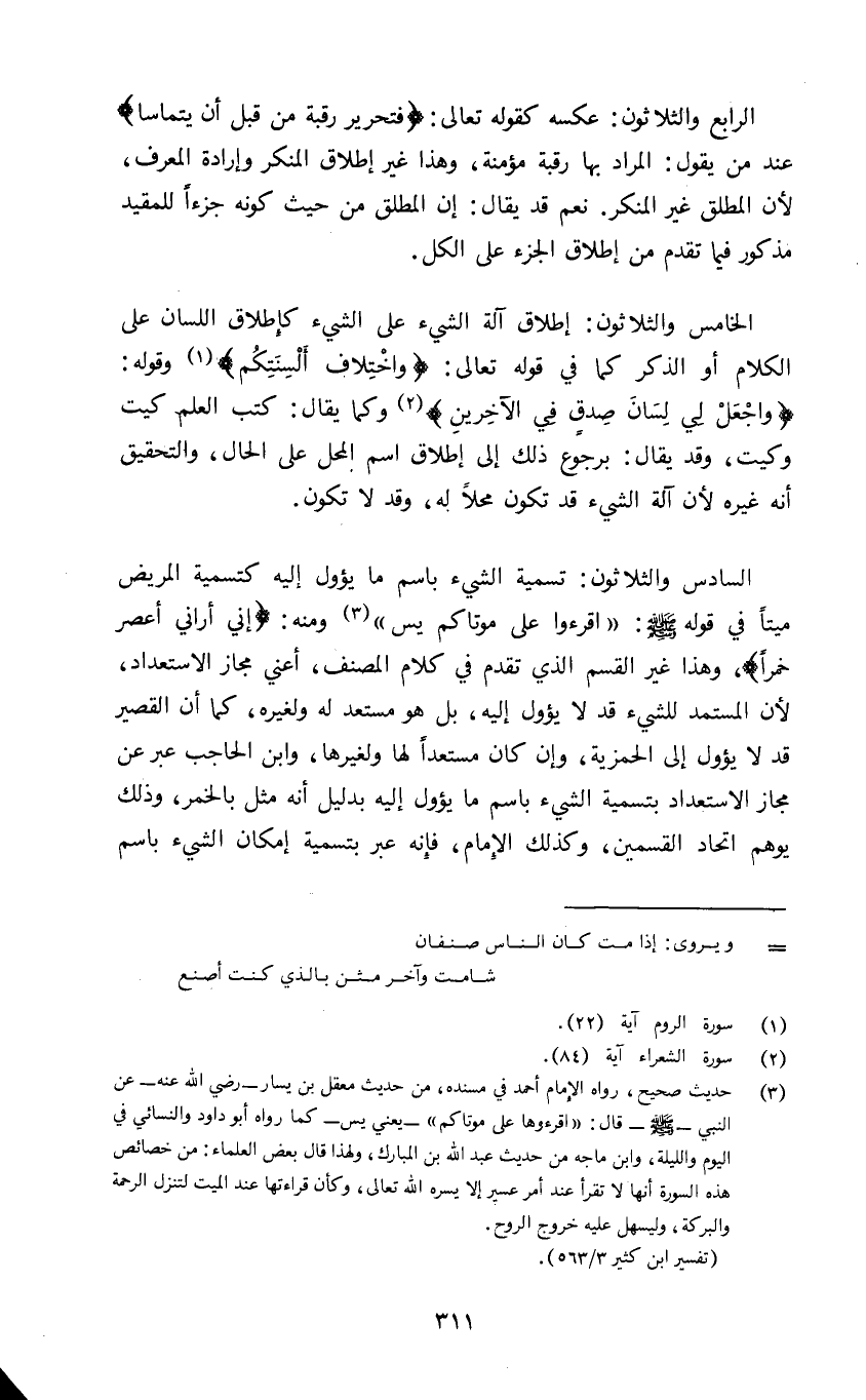 الخامس والثلاثون: إطلاق آلة الشيء على الشيء كإطلاق اللسان على الكلام أو الذكر كما في قوله تعالى: {وَاخْتِلافُ أَلْسِنَتِكُمْ} ١ وقوله: {وَاجْعَلْ لِي لِسَانَ صِدْقٍ فِي الْآخِرِينَ} ٢ وكما يقال كتب العلم كيت وكيت وقد يقال برجوع ذلك إلى إطلاق اسم المحل على الحال والتحقيق أنه غيره لأن آلة الشيء قد تكون محلا له وقد لا تكون