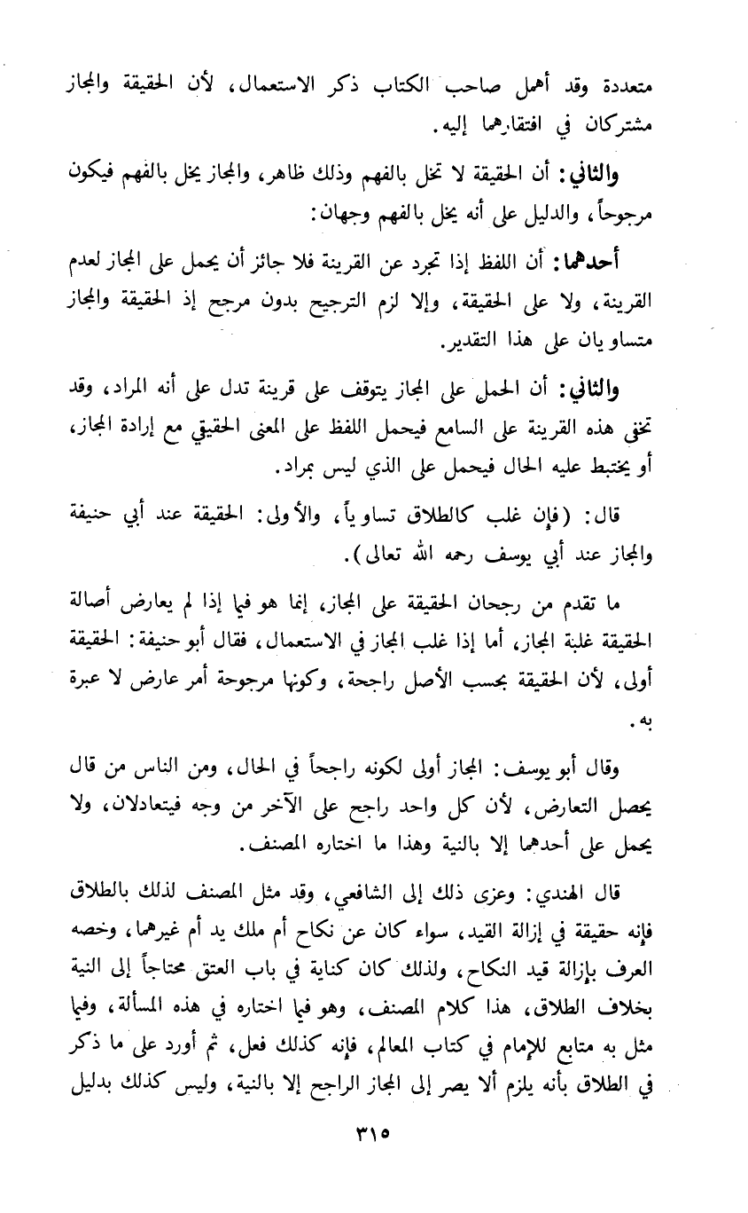 وقال أبو يوسف المجاز أولى لكونه راجحا في الحال ومن الناس من قال يحصل التعارض لأن كل واحد على الآخر من وجه فيتعادلان ولا يحمل على أحدهما إلا بالنية وهذا ما اختاره المصنف.