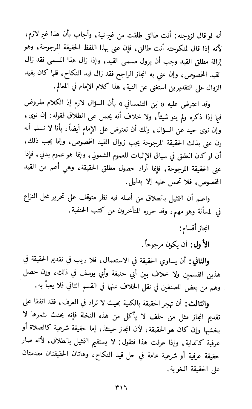 أنه لو قال لزوجته أنت طالق طلقت من غير نية وأجاب بأن هذا غير لازم لأنه إذا قال لمنكوحته أنت طالق فإن عنى بهذا اللفظ الحقيقة المرجوحة وهو إزالة مطلق القيد وجب أن يزول مسمى القيد وإذا زال هذا المسمى فقد زال القيد المخصوص وإن عني به المجاز الراجح فقد زال قيد النكاح فلما كان يفيد الزوال على التقديرين استغنى عن النية هذا كلام الإمام في المعالم.