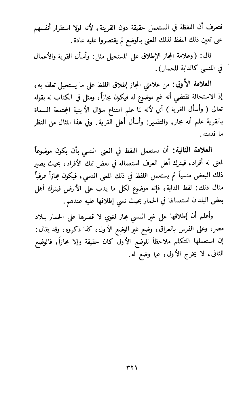 فتعرف أن اللفظة في المستعمل حقيقة دول القرينة لأنه لولا استقرار أنفسهم على تعين ذلك اللفظ لذلك المعنى بالوضع لم يقتصروا عليه عادة قال وعلامة المجاز الإطلاق على المستحيل مثل وأسأل القرية والأعمال في المنسى كالدابة للحمار.