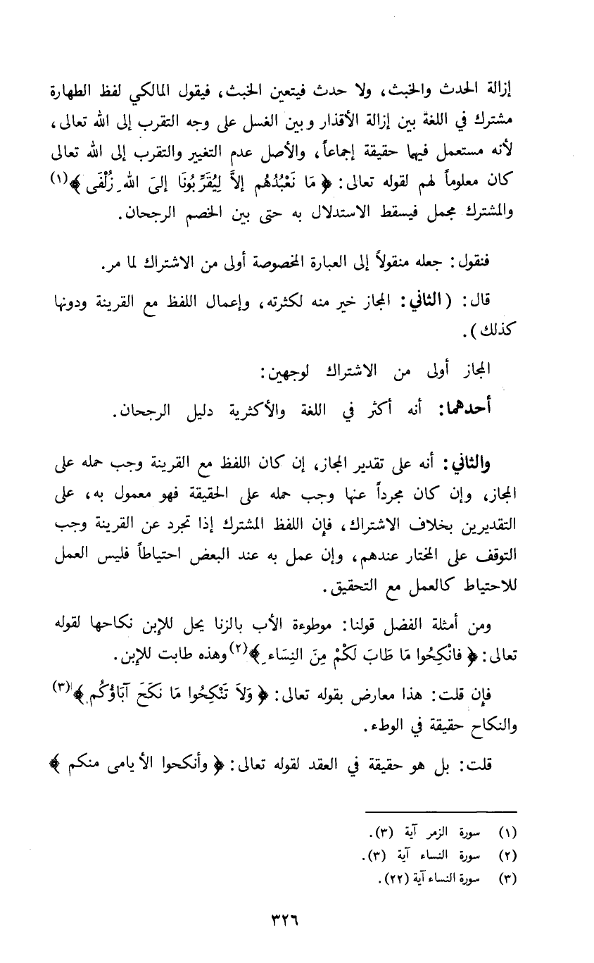 إزالة الحدث والخبث ولا حدث فيتعين الخبث فيقول المالكي لفظ الطهارة مشترك في اللغة بين إزالة الأقذار وبين الغسل على وجه التقرب إلى الله تعالى لأنه مستعمل فيهما حقيقة إجماعا والأصل عدم التغيير والتقرب إلى الله تعالى كان معلوما لهم لقوله تعالى: {مَا نَعْبُدُهُمْ إِلَّا لِيُقَرِّبُونَا إِلَى اللَّهِ زُلْفَى} ١ والمشترك مجمل فيسقط الاستدلال د به حتى بين الخصم الرجحان.
