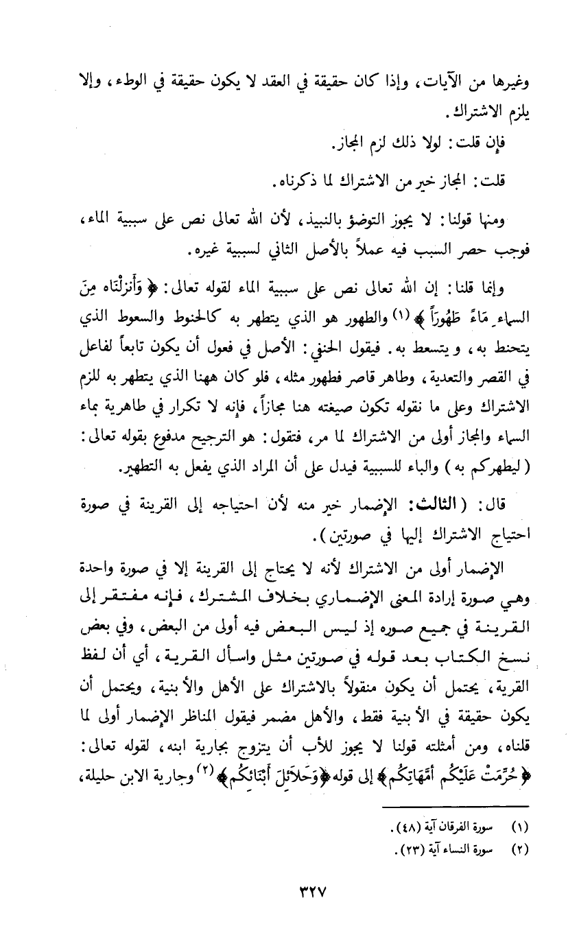 الإضمار أولى من الاشتراك لأنه لا يحتاج إلى القرينة إلا في صورة واحدة وهي صورة إرادة المعنى الإضماري بخلاف المشترك فإنه مفتقر إلى القرينة في جميع صوره إذ ليس البعض فيه أولى من البعض وفي بعض نسخ الكتاب بعد قوله في صوريتن مثل: {وَاسْأَلِ الْقَرْيَةَ} أي أن لفظ القرية يحتمل أن يكون منقولا بالاشتراك على الأهل والأبنية ويحتمل أن يكون حقيقة في الأبنية فقط والأهل مضمر فيقول المناظر الإضمار أولى لما قلناه ومن أمثلته قولنا لا يجوز للأب أن يتزوج بجارية ابنه لقوله تعالى: {حُرِّمَتْ عَلَيْكُمْ أُمَّهَاتُكُمْ} إلى قوله: {وَحَلائِلُ أَبْنَائِكُمُ} ٢ وجارية الابن حليلة.