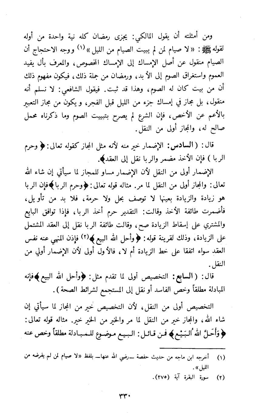 ومن أمثلته أن يقول المالكي يجزى رمضان كله نية واحدة من أوله لقوله صلى الله عليه وسلم: "لا صيام لم يبيت الصيام من الليل" ١ ووجه الاحتجاج أن الصيام منقول عن أصل الإمساك إلى الإمساك المخصوص والمعرف بأل يفيد العموم واستغراق الصوم إلى الأبد ورمضان من جملة ذلك فيكون مفهوم ذلك أن من بيت كان له الصوم وهذا قد ثبت فيقول الشافعي لا نسلم أنه منقول بل مجاز في إمساك جزء من الليل قبل الفجر ويكون من مجاز التعبير بالأعم عن الأخص فإن الشرع لم يصرح بتبييت الصوم وما ذكرناه محمل صالح له والمجاز أولى من النقل.