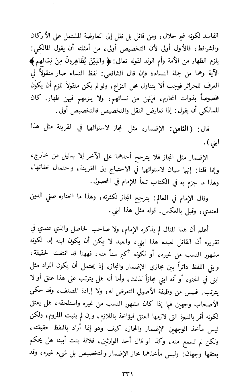 الفاسد لكونه غير حلال ومن قائل بل نقل إلى المعارضة المشتمل على الأركان والشرائط فالأول أولى لأن التخصيص أولى من امثلته أن يقول المالكي يلزم الظهار من الأمة وأم الولد لقوله تعالى: {وَالَّذِينَ يُظَاهِرُونَ مِنْ نِسَائِهِمْ} الآية وهما من جملة النساء فإذا قال الشافعي لفظ النساء صار منقولا في العرف للحرائر فوجب ألا يتناول محل النزاع ولو لم يكن منقولا للزم أن يكون مخصوصا بذوات المحارم فإنهن من نسائهم ولا يلزمهم فيهن ظهار كان للمالكي أن يقول إذا وتعارض النقل والتخصيص فالتخصيص أولى.