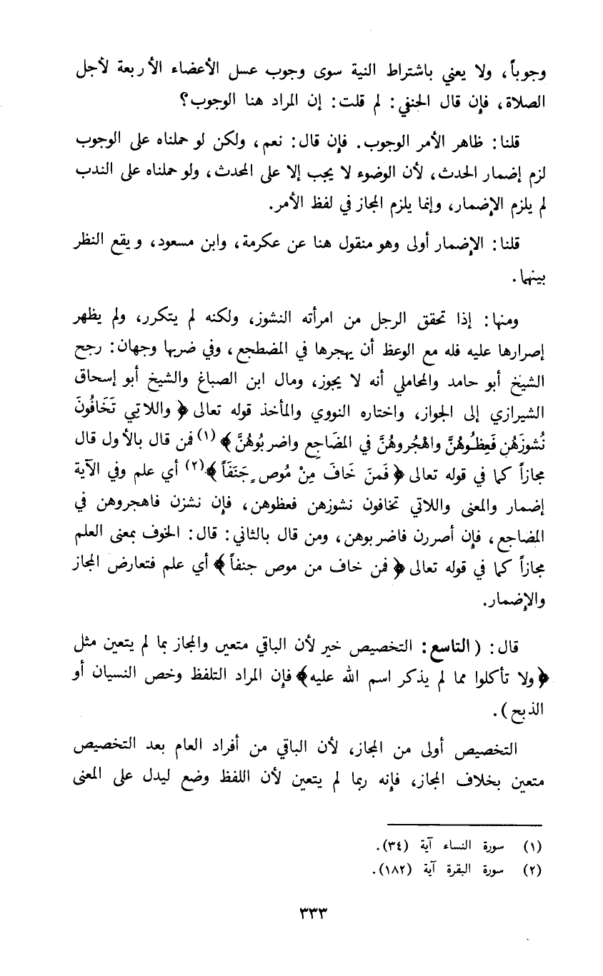 قال التاسع التخصيص خير لأن الباقي متعين والمجاز بما لم يتعين مثل: {وَلا تَأْكُلُوا مِمَّا لَمْ يُذْكَرِ اسْمُ اللَّهِ عَلَيْهِ} فإن أراد التلفظ وخص النسيان أو الذبح.