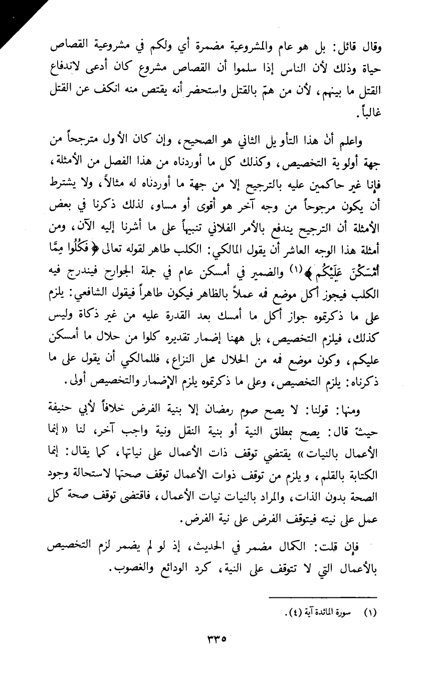 واعلم أن هذا التأويل الثاني هو الصحيح وإن كان الأول مترجحا من جهة أولوية التخصيص وكذلك كل ما أوردناه من هذا الفصل من الأمثلة فإنا غير حاكمين عليه بالترجيح إلا من جهة ما أوردناه له مثالا ولا يشترط أن يكون مرجوحا من وجه آخر هو أقوى أو مساو لذلك ذكرنا في بعض الأمثلة أن الترجيح يندفع بالأمر الفلاني تنبيها على ما أشرنا إليه الآن ومن أمثلة هذا الوجه العاشر أن يقول المالكي الكلب طاهر لقوله تعالى: {فَكُلُوا مِمَّا أَمْسَكْنَ عَلَيْكُمْ} ١ والضمير في أمسكن عام في جملة الجوارح فيندرج فيه الكلب فيجوز أكل موضع فمه عملا بالظاهر فيكون طاهرا فيقول الشافعي يلزم على ما ذكرتموه جواز أكل ما أمسك بعد القدرة عليه من غير ذكاة وليس كذلك فيلزم التخصيص بل ههنا إضمار تقديره كلوا من حلال ما أمسكن عليكم وكون موضع فمه من الحلال محل النزاع فللمالكي أن يقول على ما ذكرناه يلزم التخصيص وعلى ما ذكرتموه يلزم الإضمار والتخصيص أولى.