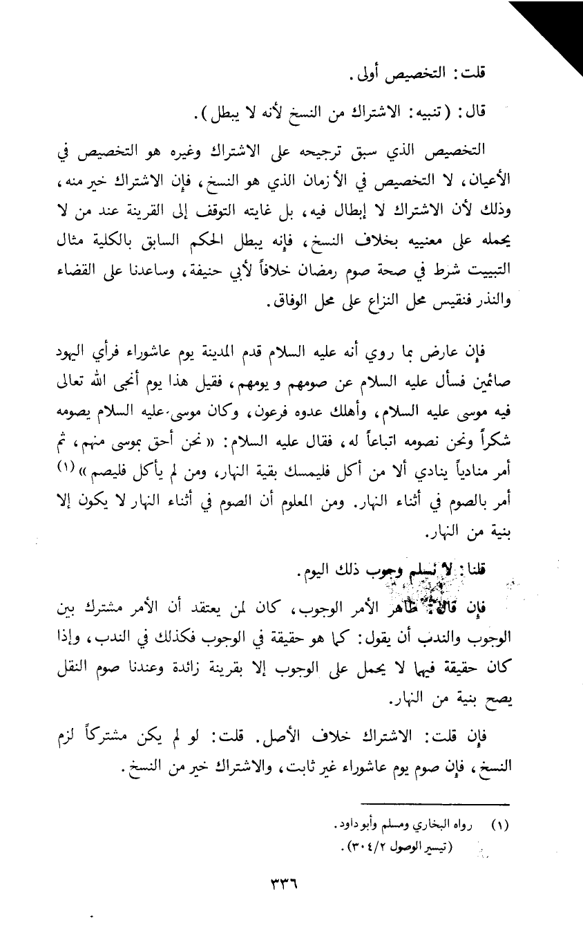فإن قلت الاشتراك خلاف الأصل قلت لو لم يكن مشتركا لزم النسخ فإن صح يوم عاشوراء غير ثابت والاشتراك خير من النسخ.