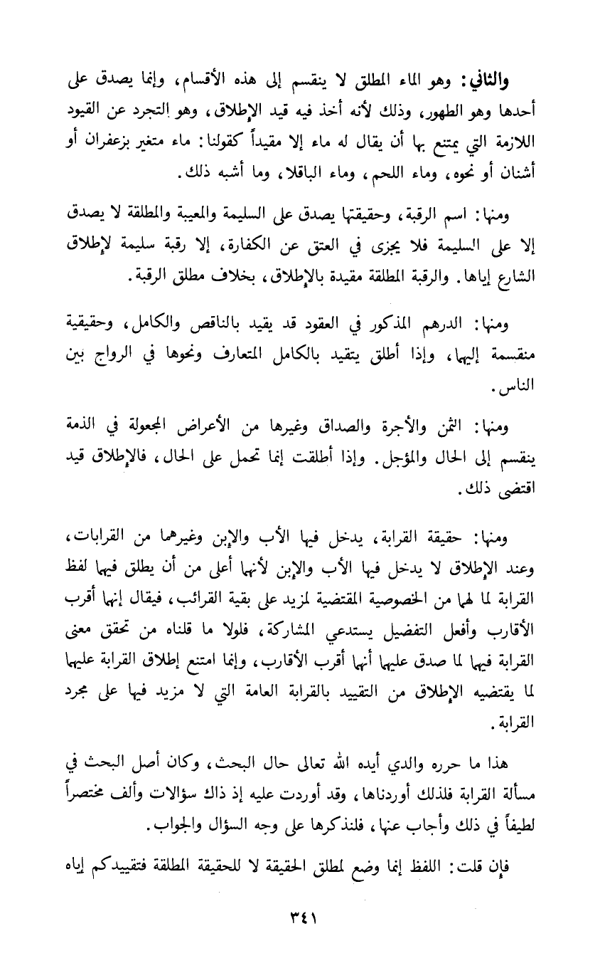 ومنها حقيقة القرابة يدخل فيها الأب والإبن وغيرهما من القرابات وعند الإطلاق لا يدخل فيها الأب والإبن لأنهما أعلى من أن يطلق فيهما لفظ القرابة لما لهما من الخصوصية المقتضية لمزيد على بقية القرائب فيقال إنهما أقرب الأقارب وأفعل التفضيل يستدعي المشاركة فلولا ما قلناه من تحقق معنى القرابة فيهما لما صدق عليهما أنهما أقرب الأقارب وإنما امتنع إطلاق القرابة عليهما لما يقتضيه الإطلاق من التقييد بالقرابة العامة التي لا مزيد فيها على مجرد القرابة.