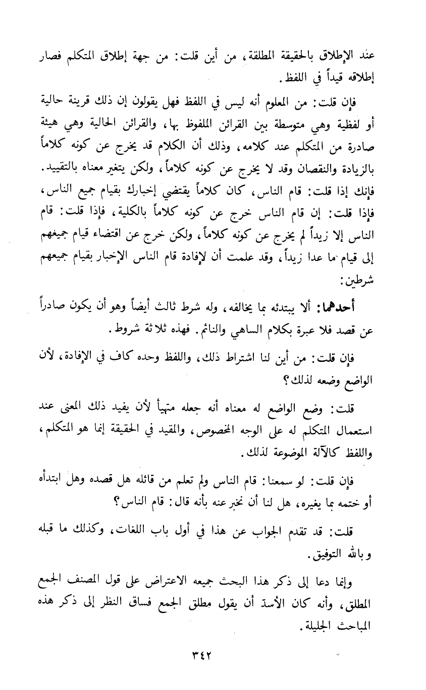 فإنك إذا قلت قام الناس كان كلاما يقتضي إخبارك بقيام جميع الناس فإذا قلت إن قام الناس خرج عن كونه كلاما بالكلية فإذا قلت قام الناس إلا زيدا لم يخرج عن كونه كلاما ولكن خرج عن اقتضاء قيام جميعهم إلى قيام ما عدا زيدا وقد علمت أن لإفادة قام الناس الإخبار بقيام جميعهم شرطين: