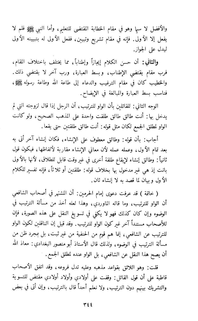 خاتمة قد عرفت دعوى إمام الحرمين أن المشتهر في أصحاب الشافعي أن الواو للترتيب وما قاله الماوردي وهذا لعله أخذ من مسألة الترتيب في الوضوء وإن كان ذلك فهو لا يكفي في تسويغ النقل على هذه الصورة فإن للأصحاب مستندا آخر غير كون الواو للترتيب وقد قيل إن الناقلين لكون الواو للترتيب عن الشافعي إنما هم قوم من الحنفية من غير ثبت بل بمجرد ظن من مسألة الترتيب في الوضوء ولذلك قال الأستاذ أبو منصور البغدادي معاذ الله أن يصح هذا النقل عن الشافعي بل الواو عنده لمطلق الجمع.