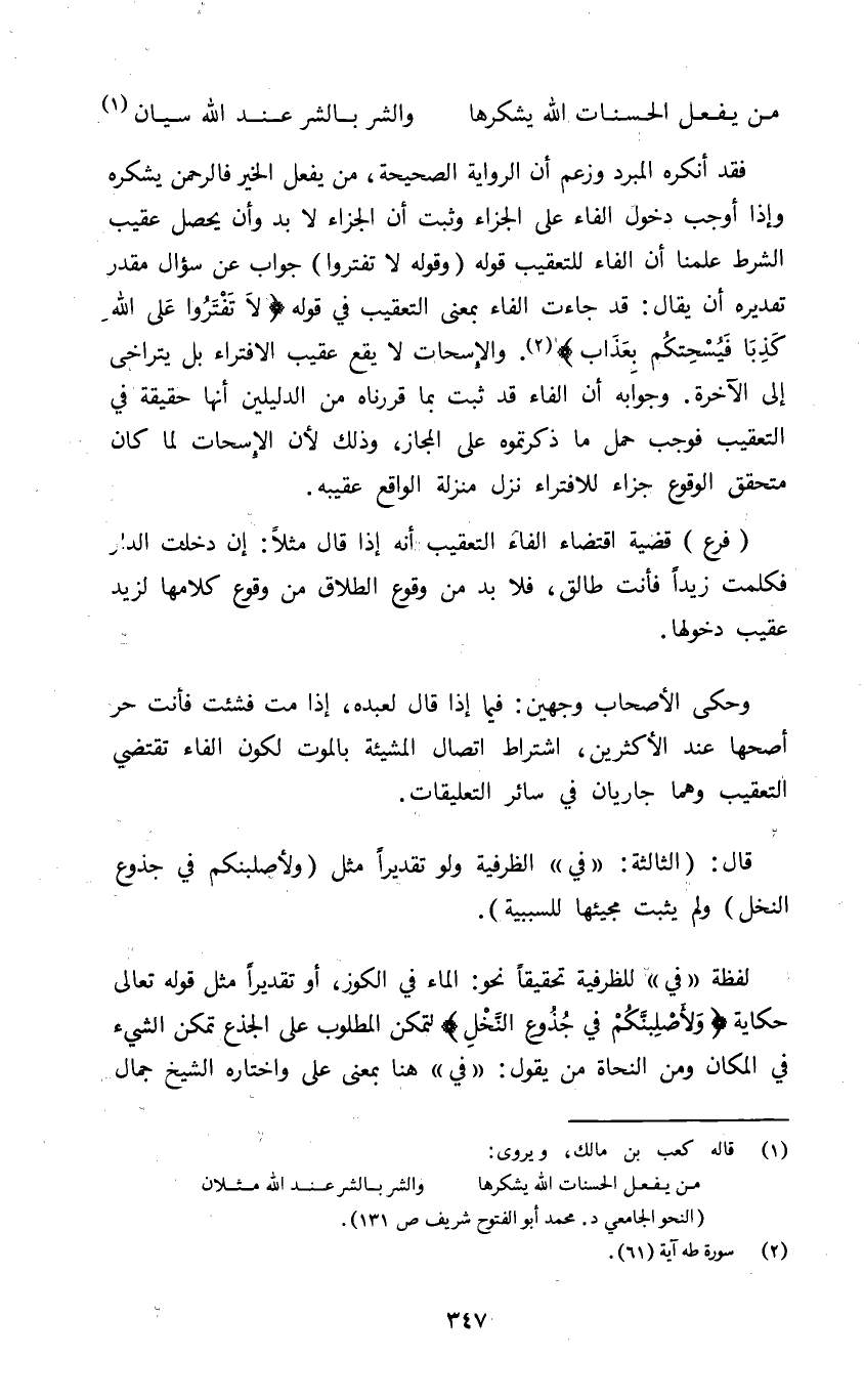 فقد أنكره المبرد وزعم أن الرواية الصحيحة من يفعل الخير فالرحمن يشكره وإذا أوجب دخول الفاء على الجزاء وثبت أن الجزاء لا بد وأن يحصل عقيب الشرط علمنا أن الفاء للتعقيب قوله وقوله: {لا تَفْتَرُوا} جواب عن سؤال مقدر تقديره أن يقال قد جاءت الفاء بمعنى التعقيب في قوله: {لا تَفْتَرُوا عَلَى اللَّهِ كَذِباً فَيُسْحِتَكُمْ بِعَذَابٍ} ٢ والإسحات لا يقع عقيب الافتراء بل يتراخى إلى الآخره وجوابه أن الفاء قد ثبت بما قررناه من الدليلين أنها حقيقة في التعقيب فوجب حمل ما ذكرتموه على المجاز وذلك لأن الإسحات لما كان متحقق الوقوع جزاء للافتراء نزل منزلة الواقع عقيبه.