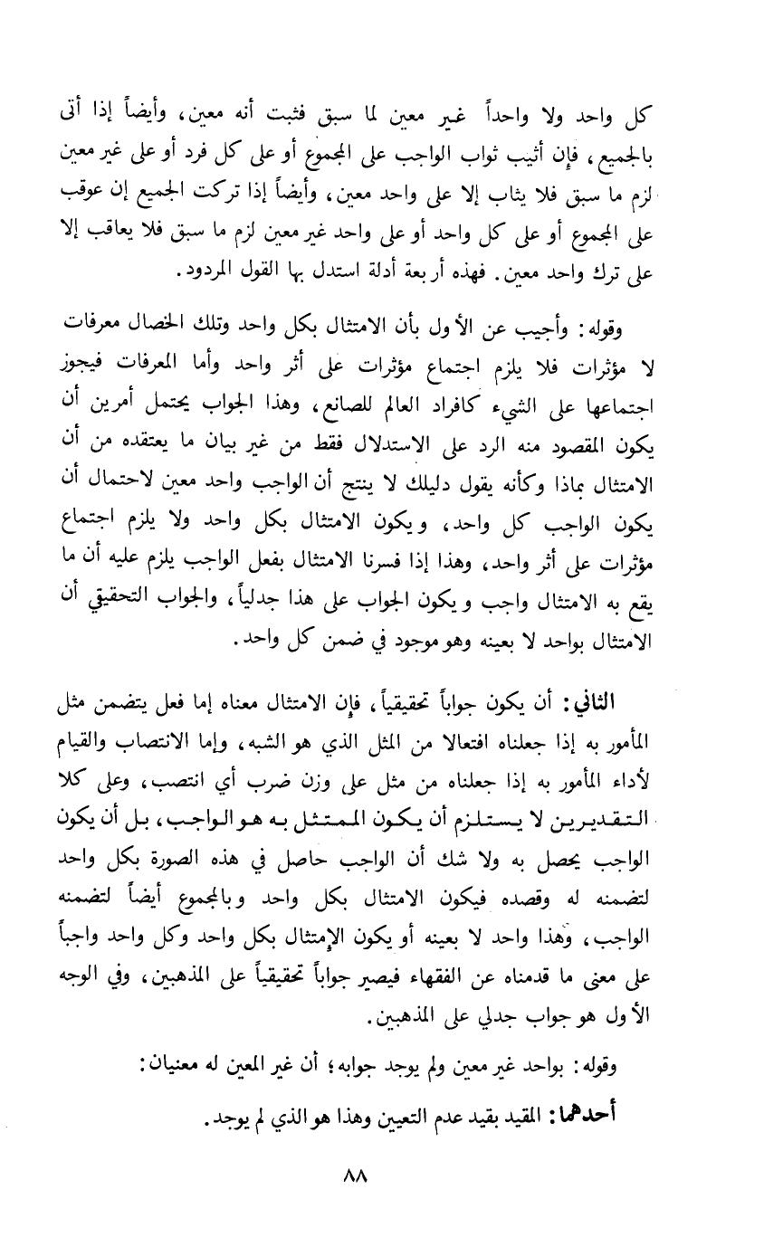 الثاني: أن يكون جوابا تحقيقيا فإن الامتثال معناه إما فعل يتضمن مثل المأمور به إذا جعلناه افتعالا من المثل الذي هو الشبه وإما الانتصاب والقيام لأداء المأمور به إذا جعلناه من مثل على وزن ضرب أي انتصب وعلى كلا التقديرين لا يستلزم أن يكون الممتثل به هو الواجب بل أن يكون الواجب يحصل به ولا شك أن الواجب حاصل في هذه الصورة بكل واحد لتضمنه له وقصده فيكون الامتثال بكل واحد وبالمجموع أيضا لتضمنه الواجب وهذا واحد لا بعينه أو يكون الإمتثال بكل واحد وكل واحد واجبا على معنى ما قدمناه عن الفقهاء فيصير جوابا تحقيقيا على المذهبين وفي الوجه الأول هو جواب جدلي على المذهبين.