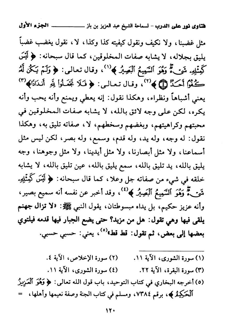 وجه يليق بالله، يد تليق بالله، سمع يليق بالله، عين تليق بالله. لا يشابه الخلق في شيء من صفاته جل وعلا، كما قال سبحانه وتعالى: {لَيْسَ كَمِثْلِهِ شَيْءٌ وَهُوَ السَّمِيعُ الْبَصِيرُ} (¬4). . وقد أخبر عن نفسه أنه سميع بصير، وأنه عزيز حكيم، بل يداه مبسوطتان. يقول النبي - صلى الله عليه وسلم -: «لا تزال جهنم يلقى فيها، وهي تقول: هل من مزيد؟ حتى يضع الجبار فيها قدمه، فيلتوي بعضها إلى بعض، ثم تقول: قط قط (¬5)»، يعني حسبي حسبي.