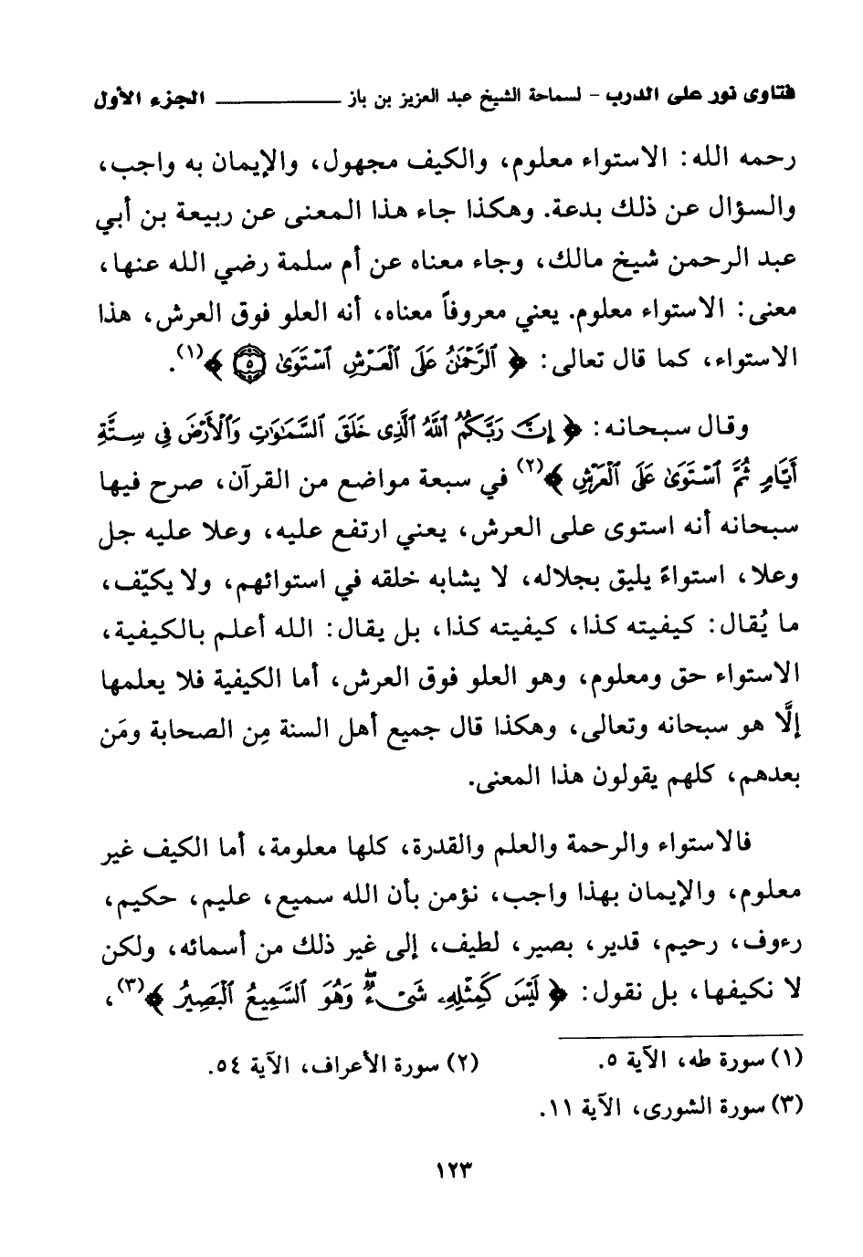 وهكذا جاء هذا المعنى عن ربيعة بن أبي عبد الرحمن شيخ مالك، وجاء معناه عن أم سلمة رضي الله عنها: معنى: الاستواء معلوم. يعني معروفا معناه، أنه العلو فوق العرش. هذا الاستواء، كما قال تعالى: {الرَّحْمَنُ عَلَى الْعَرْشِ اسْتَوَى} (¬1). . وقال سبحانه: {إِنَّ رَبَّكُمُ اللَّهُ الَّذِي خَلَقَ السَّمَاوَاتِ وَالْأَرْضَ فِي سِتَّةِ أَيَّامٍ ثُمَّ اسْتَوَى عَلَى الْعَرْشِ} (¬2). في سبعة مواضع من القرآن، صرح فيها سبحانه أنه استوى على العرش، يعني ارتفع عليه، وعلا عليه جل وعلا.