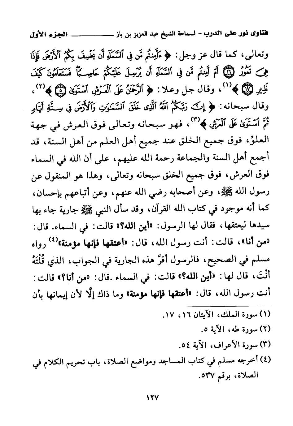وقد سأل النبي - صلى الله عليه وسلم - جارية جاء بها سيدها ليعتقها، «فقال لها الرسول: " أين الله "؟ قالت: في السماء، قال: "من أنا"؟ قالت: أنت رسول الله، قال: أعتقها فإنها مؤمنة (¬5)» رواه مسلم في الصحيح. فالرسول أقر هذه الجارية في الجواب الذي قلته أنت، «قال لها: " أين الله "؟ قالت: في السماء. قال: " من أنا "؟ قالت: أنت رسول الله، قال: أعتقها فإنها مؤمنة».