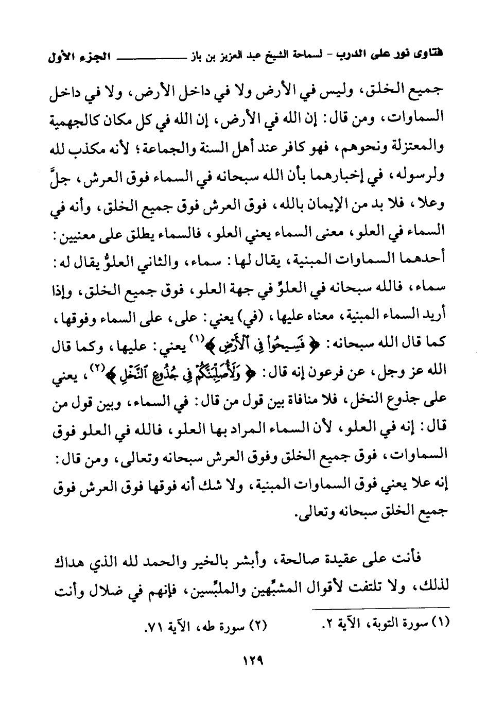جميع الخلق، وليس في الأرض ولا في داخل الأرض، ولا في داخل السماوات، ومن قال: إن الله في الأرض، إن الله في كل مكان كالجهمية والمعتزلة ونحوهم فهو كافر عند أهل السنة والجماعة؛ لأنه مكذب لله ولرسوله، في إخبارهما بأن الله سبحانه في السماء فوق العرش جل وعلا، فلا بد من الإيمان بالله، فوق العرش فوق جميع الخلق، وأنه في السماء في العلو معنى السماء يعني العلو، فالسماء يطلق على معنيين أحدهما: السماوات المبنية، يقال لها: سماء، والثاني العلو يقال له: سماء فالله سبحانه في العلو في جهة العلو، فوق جميع الخلق، وإذا أريد السماء المبنية معناه عليها (في) يعني على، على السماء وفوقها كما قال الله سبحانه: {فَسِيحُوا فِي الْأَرْضِ} (¬1)، يعني: عليها، وكما قال الله عز وجل عن فرعون إنه قال: {وَلَأُصَلِّبَنَّكُمْ فِي جُذُوعِ النَّخْلِ} (¬2)، يعني على جذوع النخل فلا منافاة بين قول من قال: في السماء، وبين قول من قال: إنه في العلو؛ لأن السماء المراد بها العلو، فالله في العلو فوق السماوات فوق جميع الخلق وفوق العرش سبحانه وتعالى، ومن قال: إنه علا يعني فوق السماوات المبنية، ولا شك أنه فوقها فوق العرش فوق جميع الخلق سبحانه وتعالى.