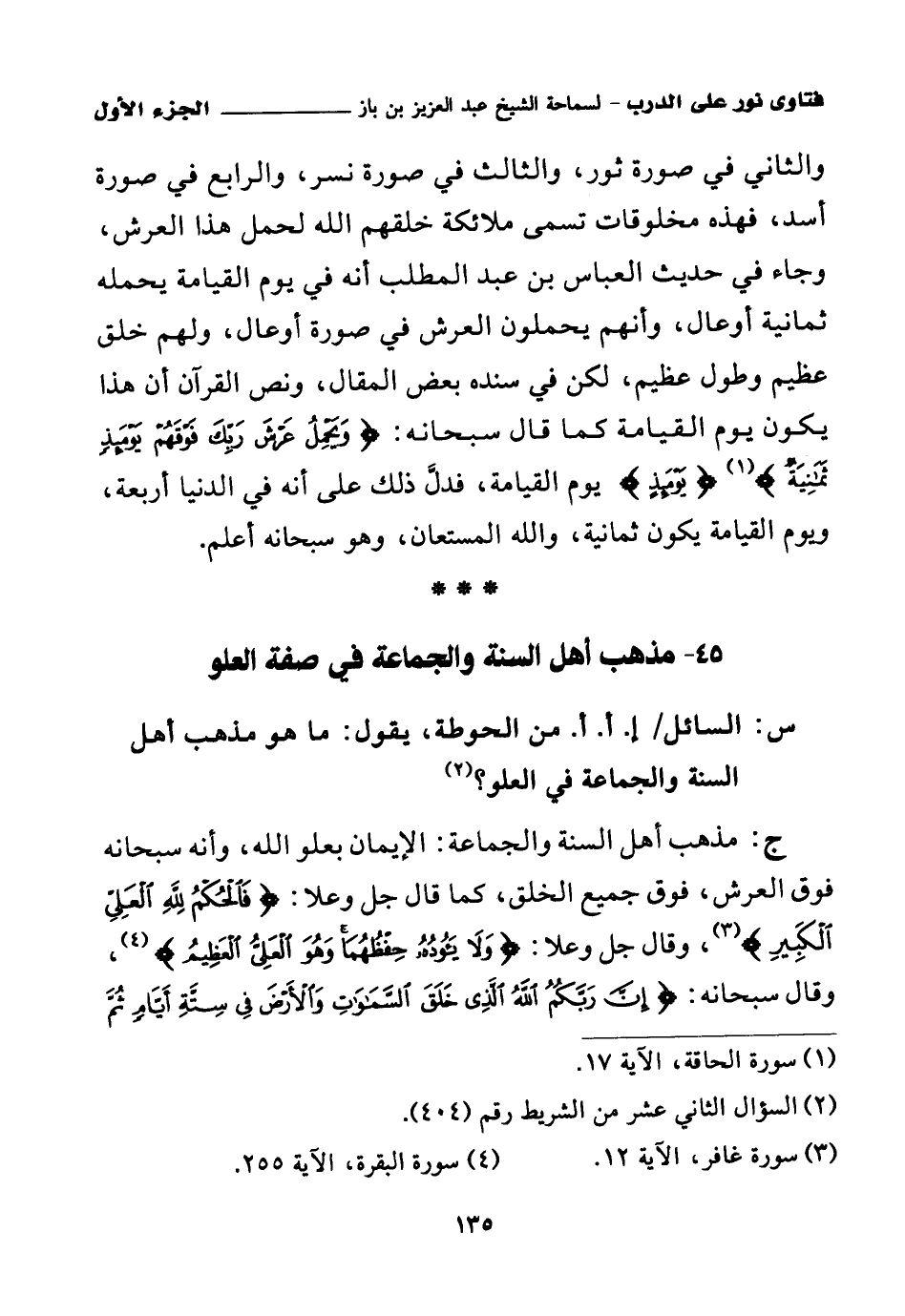 ج: مذهب أهل السنة والجماعة: الإيمان بعلو الله، وأنه سبحانه فوق العرش، فوق جميع الخلق، كما قال جل وعلا: {فَالْحُكْمُ لِلَّهِ الْعَلِيِّ الْكَبِيرِ} (¬2) وقال جل وعلا: {وَلَا يَئُودُهُ حِفْظُهُمَا وَهُوَ الْعَلِيُّ الْعَظِيمُ} (¬3)، وقال سبحانه: {إِنَّ رَبَّكُمُ اللَّهُ الَّذِي خَلَقَ السَّمَاوَاتِ وَالْأَرْضَ فِي سِتَّةِ أَيَّامٍ ثُمَّ اسْتَوَى عَلَى الْعَرْشِ} (¬4)