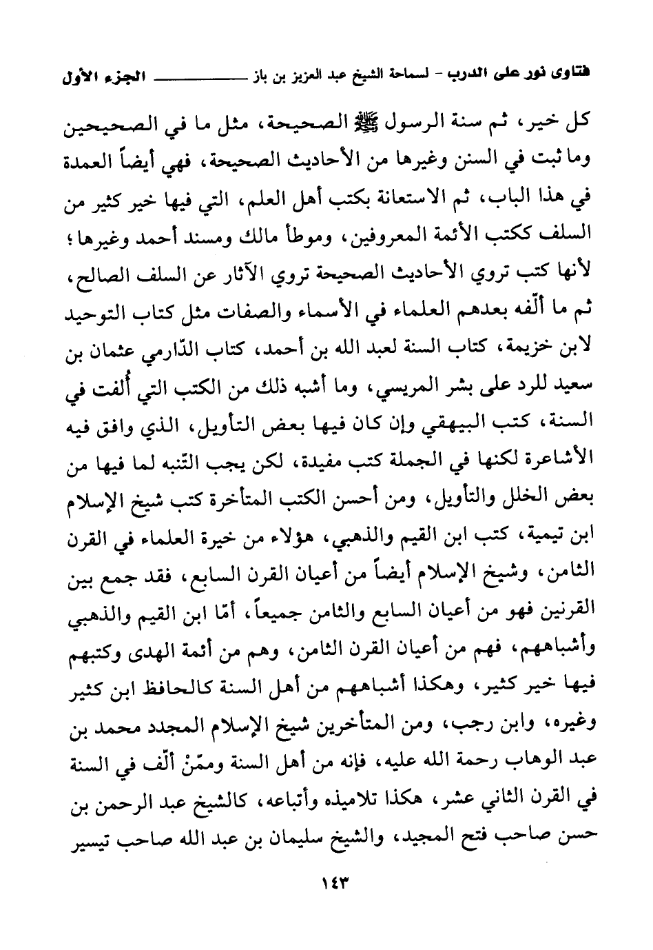 كل خير، ثم سنة الرسول صلى الله عليه وسلم الصحيحة، مثل ما في الصحيحين وما ثبت في السنن وغيرها من الأحاديث الصحيحة، فهي أيضا العمدة في هذا الباب، ثم الاستعانة بكتب أهل العلم، التي فيها خير كثير من السلف ككتب الأئمة المعروفين، وموطأ مالك ومسند أحمد وغيرها؛ لأنها كتب تروي الأحاديث الصحيحة تروي الآثار عن السلف الصالح، ثم ما ألفه بعدهم العلماء في الأسماء والصفات مثل كتاب التوحيد لابن خزيمة، كتاب السنة لعبد الله بن أحمد، كتاب الدارمي عثمان بن سعيد للرد على بشر المريسي، وما أشبه ذلك من الكتب التي ألفت في السنة، كتب البيهقي وإن كان فيها بعض التأويل، الذي وافق فيه الأشاعرة لكنها في الجملة كتب مفيدة، لكن يجب التنبه لما فيها من بعض الخلل والتأويل، ومن أحسن الكتب المتأخرة كتب شيخ الإسلام ابن تيمية، كتب ابن القيم والذهبي، هؤلاء من خيرة العلماء في القرن الثامن، وشيخ الإسلام أيضا من أعيان القرن السابع، فقد جمع بين القرنين فهو من أعيان السابع والثامن جميعا، أما ابن القيم والذهبي وأشباههم، فهم من أعيان القرن الثامن، وهم من أئمة الهدى وكتبهم فيها خير كثير، وهكذا أشباههم من أهل السنة كالحافظ ابن كثير وغيره، وابن رجب، ومن المتأخرين شيخ الإسلام المجدد محمد بن عبد الوهاب رحمة الله عليه، فإنه من أهل السنة وممن ألف في السنة في القرن الثاني عشر، هكذا تلاميذه وأتباعه، كالشيخ عبد الرحمن بن حسن صاحب فتح المجيد، والشيخ سليمان بن عبد الله صاحب تيسير