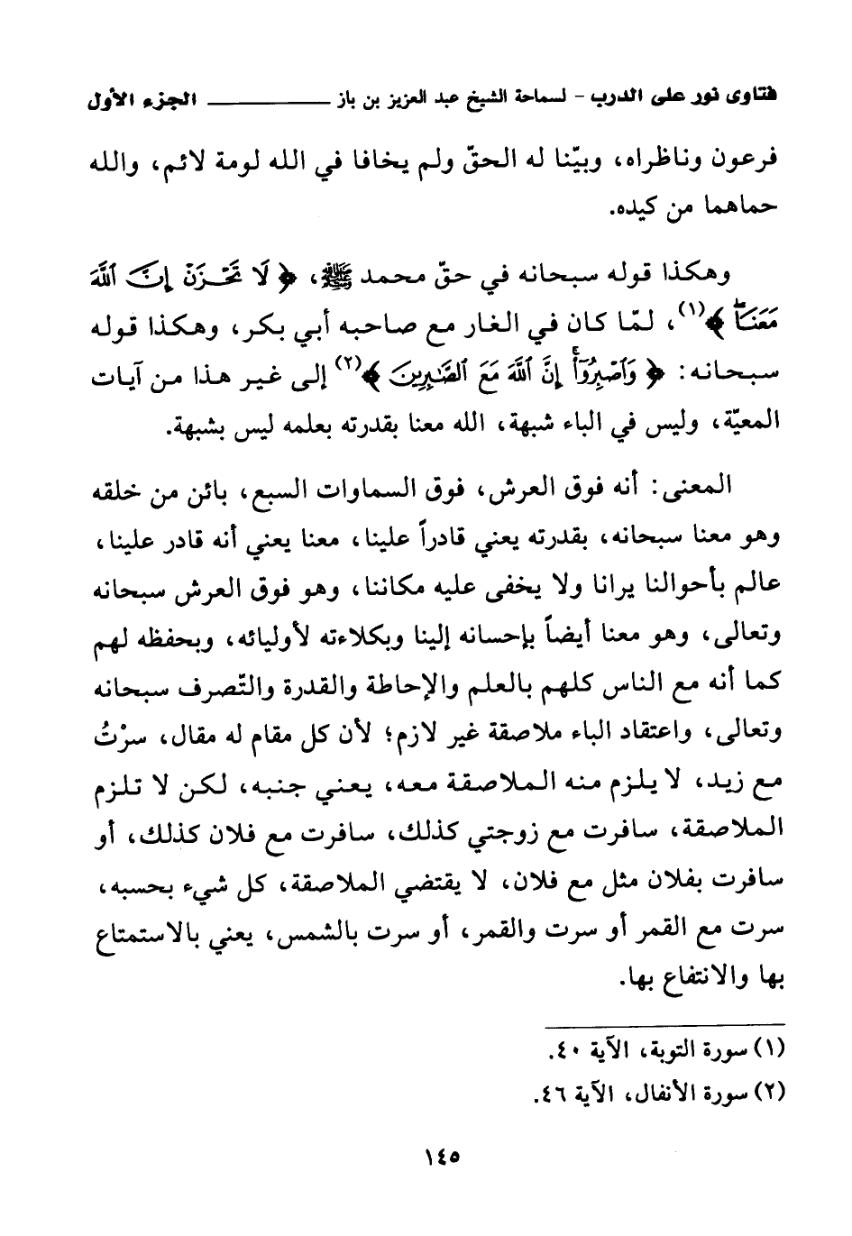 وهكذا قوله سبحانه في حق محمد صلى الله عليه وسلم {لَا تَحْزَنْ إِنَّ اللَّهَ مَعَنَا} (¬1)، لما كان في الغار مع صاحبه أبي بكر، وهكذا قوله سبحانه: {وَاصْبِرُوا إِنَّ اللَّهَ مَعَ الصَّابِرِينَ} (¬2) إلى غير هذا من آيات المعية، وليس في الباء شبهة، الله معنا بقدرته بعلمه ليس بشبهة.