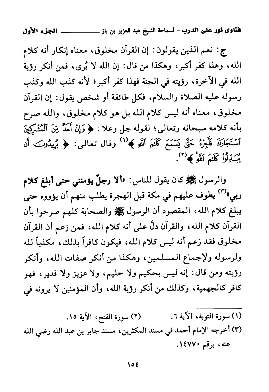 والرسول صلى الله عليه وسلم كان يقول للناس: «ألا رجل يؤمنني حتى أبلغ كلام ربي (¬3)» يطوف عليهم في مكة قبل الهجرة يطلب منهم أن يؤووه حتى يبلغ كلام الله، المقصود أن الرسول صلى الله عليه وسلم والصحابة كلهم صرحوا بأن القرآن كلام الله، والقرآن دل على أنه كلام الله، فمن زعم أن القرآن مخلوق فقد زعم أنه ليس كلام الله، فيكون كافرا بذلك، مكذبا لله ولرسوله ولإجماع المسلمين، وهكذا من أنكر صفات الله، وأنكر رؤيته ومن قال: إنه ليس بحكيم ولا حليم، ولا عزيز ولا قدير، فهو كافر كالجهمية، وكذلك من أنكر رؤية الله، وأن المؤمنين لا يرونه في