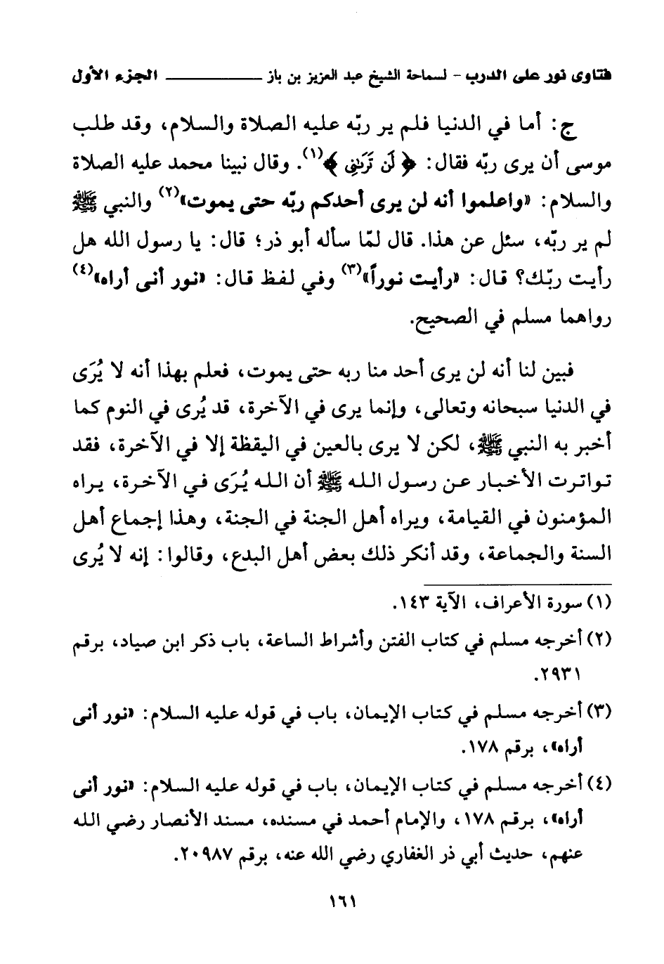 ج: أما في الدنيا فلم ير ربه - عليه الصلاة والسلام، وقد طلب موسى أن يرى ربه فقال. {لَنْ تَرَانِي} (¬1)، وقال نبينا محمد عليه الصلاة والسلام: «واعلموا أنه لن يرى أحدكم ربه حتى يموت (¬2)»، والنبي صلى الله عليه وسلم لم ير ربه، سئل عن هذا، قال لما سأله أبو ذر، قال «يا رسول الله: هل رأيت ربك؟ قال: رأيت نورا (¬3)»، وفي لفظ قال: «نور أنى أراه (¬4)»، رواهما مسلم في الصحيح.