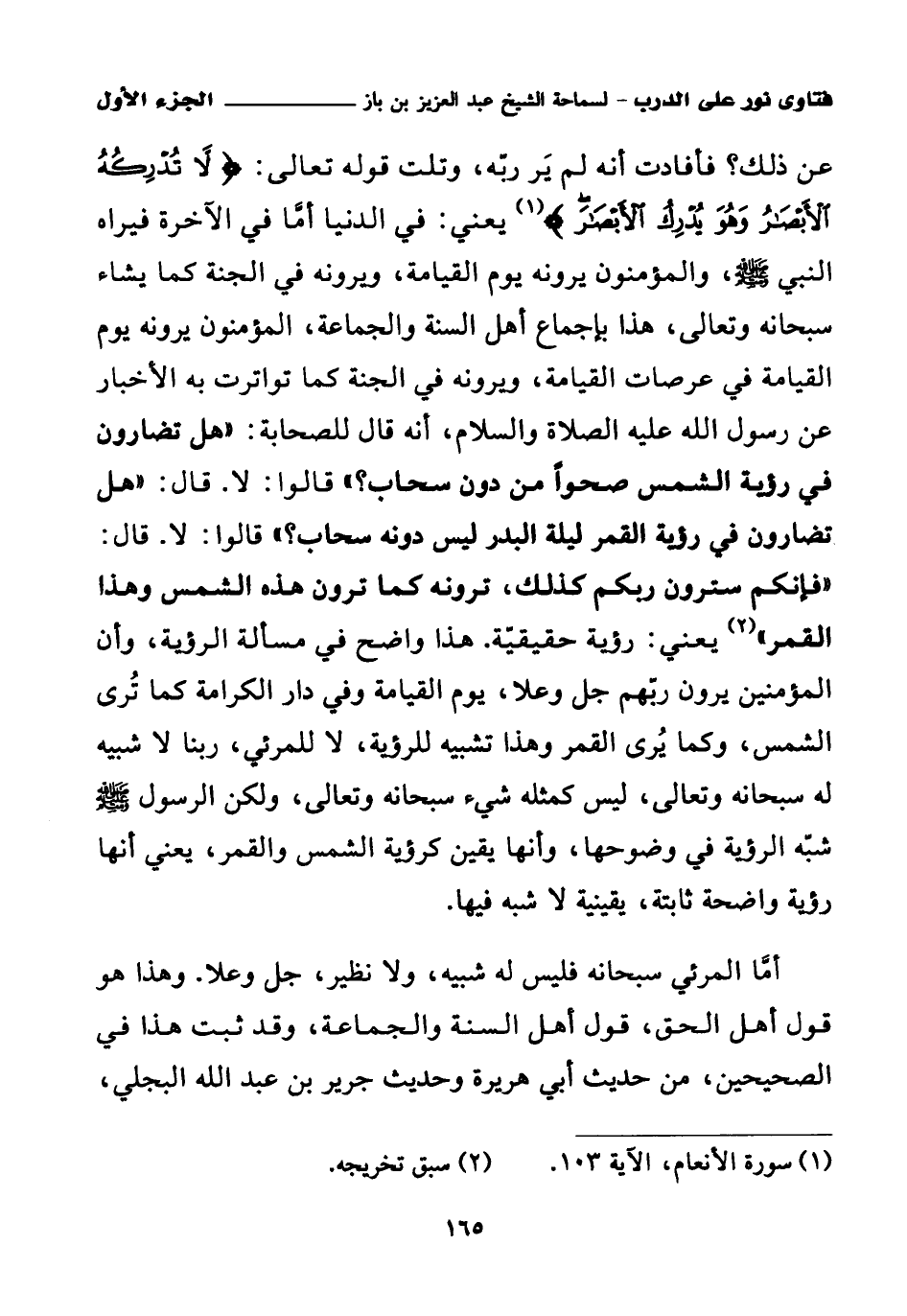 أما المرئي سبحانه فليس له شبيه، ولا نظير، جل وعلا. وهذا هو قول أهل الحق، قول أهل السنة والجماعة، وقد ثبت هذا في الصحيحين، من حديث أبي هريرة وحديث جرير بن عبد الله البجلي،
