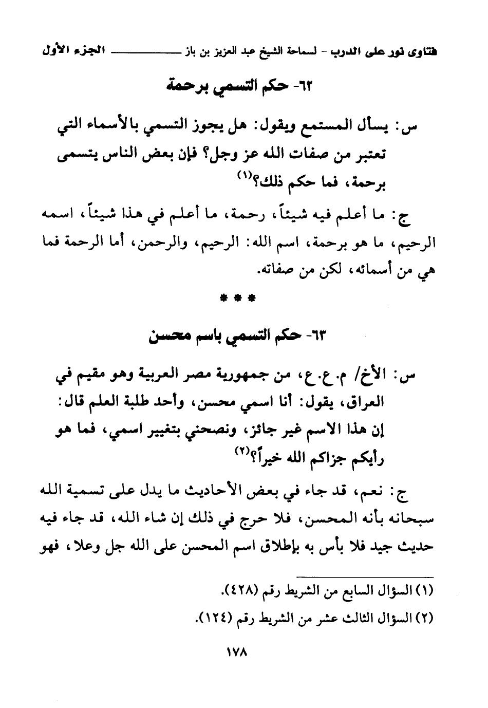 كتاب فتاوى نور على الدرب لابن باز بعناية الشويعر (اسم الجزء: 1)