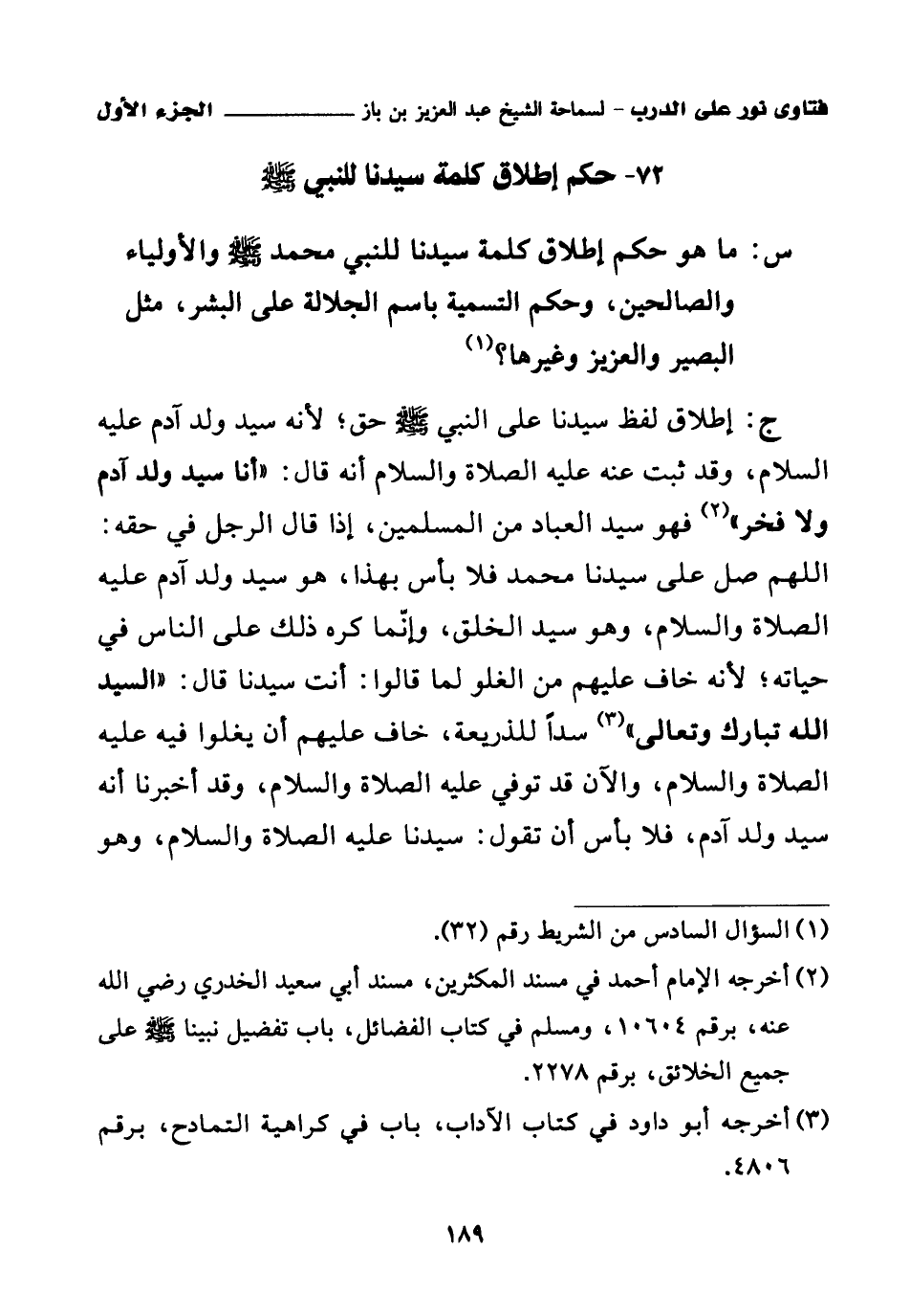 ج: إطلاق لفظ سيدنا على النبي صلى الله عليه وسلم حق؛ لأنه سيد ولد آدم عليه السلام، وقد ثبت عنه عليه الصلاة والسلام أنه قال: «أنا سيد ولد آدم ولا فخر (¬2)» فهو سيد العباد من المسلمين، إذا قال الرجل في حقه: اللهم صل على سيدنا محمد فلا بأس بهذا، هو سيد ولد آدم عليه الصلاة والسلام، وهو سيد الخلق، وإنما كره ذلك على الناس في حياته؛ لأنه خاف عليهم من الغلو لما قالوا: أنت سيدنا قال: «السيد الله تبارك وتعالى (¬3)» سدا للذريعة، خاف عليهم أن يغلوا فيه عليه الصلاة والسلام، والآن قد توفي عليه الصلاة والسلام، وقد أخبرنا أنه سيد ولد آدم، فلا بأس أن تقول: سيدنا عليه الصلاة والسلام، وهو