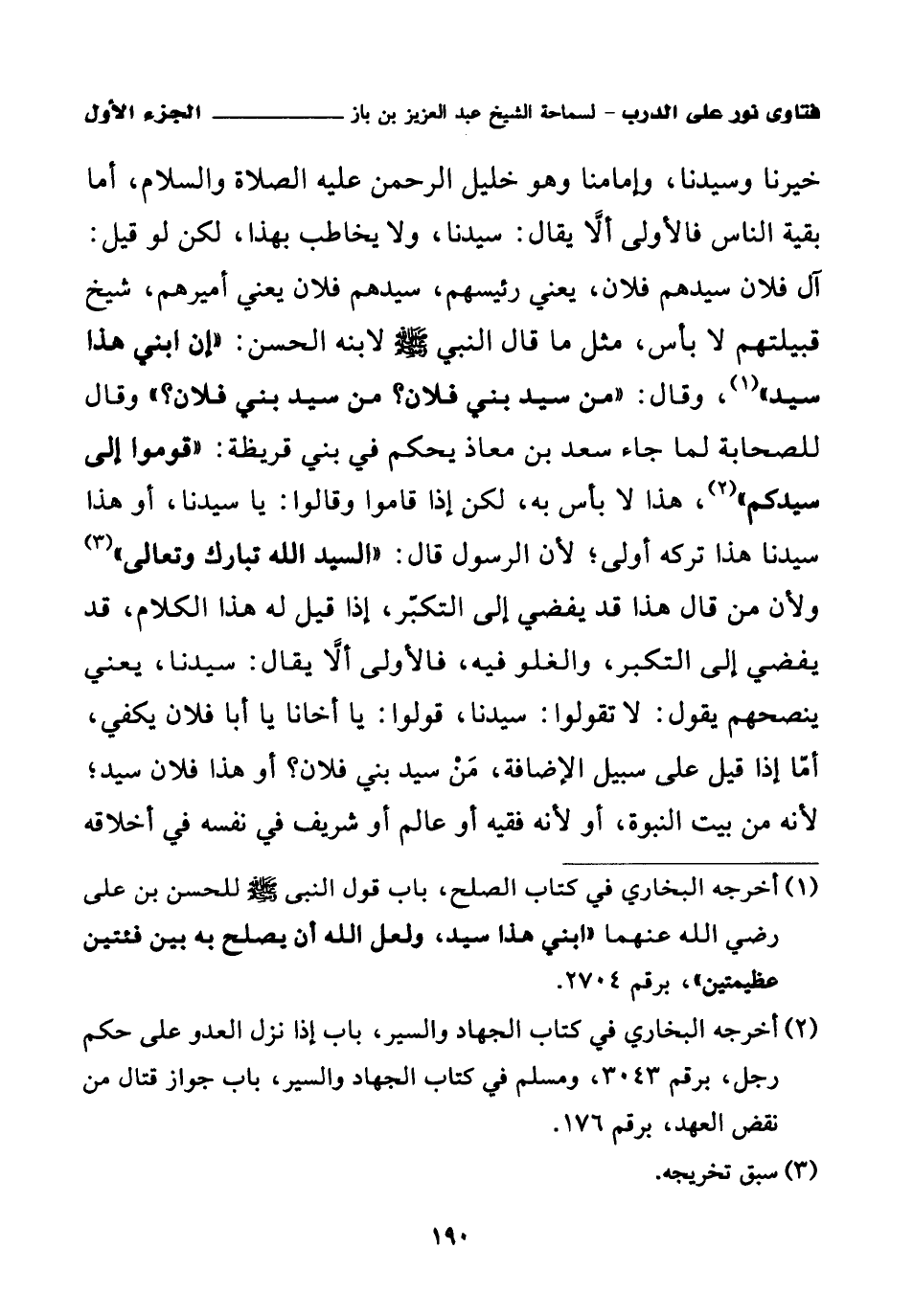 خيرنا وسيدنا، وإمامنا وهو خليل الرحمن عليه الصلاة والسلام، أما بقية الناس فالأولى ألا يقال: سيدنا، ولا يخاطب بهذا، لكن لو قيل: آل فلان سيدهم فلان، يعني رئيسهم، سيدهم فلان يعني أميرهم، شيخ قبيلتهم لا بأس، مثل ما قال النبي صلى الله عليه وسلم لابنه الحسن: «إن ابني هذا سيد (¬1)»، وقال: " من سيد بني فلان؟ من سيد بني فلان؟ وقال للصحابة لما جاء سعد بن معاذ يحكم في بني قريظة: «قوموا إلى سيدكم (¬2)» هذا لا بأس به، لكن إذا قاموا وقالوا: يا سيدنا، أو هذا سيدنا هذا تركه أولى؛ لأن الرسول قال: «السيد الله تبارك وتعالى (¬3)» ولأن من قال هذا قد يفضي إلى التكبر، إذا قيل له هذا الكلام، قد يفضي إلى التكبر، والغلو فيه، فالأولى ألا يقال: سيدنا، يعني ينصحهم يقول: لا تقولوا: سيدنا، قولوا: يا أخانا يا أبا فلان يكفي، أما إذا قيل على سبيل الإضافة، من سيد بني فلان؟ أو هذا فلان سيد: لأنه من بيت النبوة، أو لأنه فقيه أو عالم أو شريف في نفسه في أخلاقه