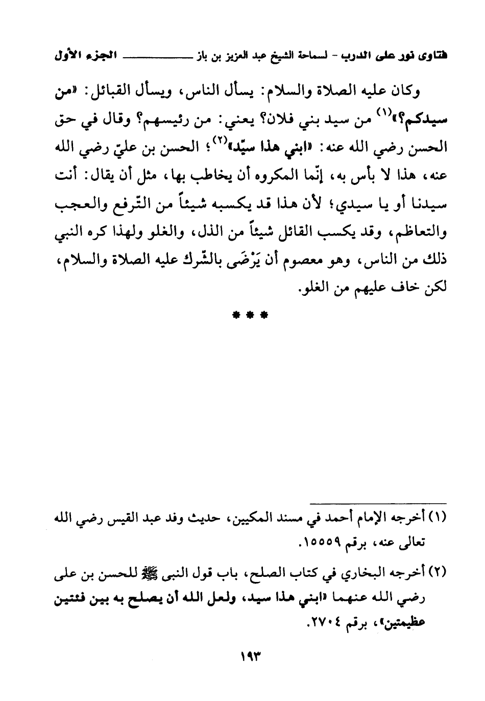 «وكان عليه الصلاة والسلام: يسأل الناس، ويسأل القبائل: من سيدكم؟ (¬1)» من سيد بني فلان؟ يعني: من رئيسهم؛ وقال في حق الحسن رضي الله عنه: «ابني هذا سيد (¬2)»؛ الحسن بن علي رضي الله عنه، هذا لا بأس به، إنما المكروه أن يخاطب بها مثل أن يقال: أنت سيدنا أو يا سيدي؛ لأن هذا قد يكسبه شيئا من الترفع والعجب والتعاظم، وقد يكسب القائل شيئا من الذل، والغلو ولهذا كره النبي ذلك من الناس، وهو معصوم أن يرضى بالشرك عليه الصلاة والسلام، لكن خاف عليهم من الغلو.