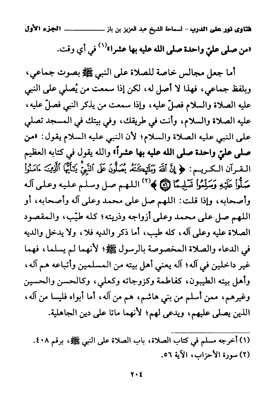 أما جعل مجالس خاصة للصلاة على النبي صلى الله عليه وسلم بصوت جماعي وبلفظ جماعي، فهذا لا أصل له، لكن إذا سمعت من يصلي على النبي عليه الصلاة والسلام فصل عليه، وإذا سمعت من يذكر النبي فصل عليه، عليه الصلاة والسلام، وأنت في طريقك، وفي بيتك في المسجد تصلي على النبي عليه الصلاة والسلام؛ لأن النبي عليه السلام يقول: «من صلى علي واحدة صلى الله عليه بها عشرا» والله يقول في كتابه العظيم القرآن الكريم: {إِنَّ اللَّهَ وَمَلَائِكَتَهُ يُصَلُّونَ عَلَى النَّبِيِّ يَا أَيُّهَا الَّذِينَ آمَنُوا صَلُّوا عَلَيْهِ وَسَلِّمُوا تَسْلِيمًا} (¬2) اللهم صل وسلم عليه وعلى آله وأصحابه، وإذا قلت: اللهم صل على محمد وعلى آله وأصحابه، أو اللهم صل على محمد وعلى أزواجه وذريته؛ كله طيب، والمقصود الصلاة عليه وعلى آله، كله طيب، أما ذكر والديه فلا، ولا يدخل والديه في الدعاء والصلاة المخصوصة بالرسول صلى الله عليه وسلم؛ لأنهما لم يسلما، فهما غير داخلين في آله؛ آله يعني أهل بيته من المسلمين وأتباعه هم آله، وأهل بيته الطيبون، كفاطمة وكزوجاته وكعلي وكالحسن والحسين وغيرهم، ممن أسلم من بني هاشم، هم من آله، أما أبواه فليسا من آله، الذين يصلى عليهم، ويدعى لهم؛ لأنهما ماتا على دين الجاهلية.
