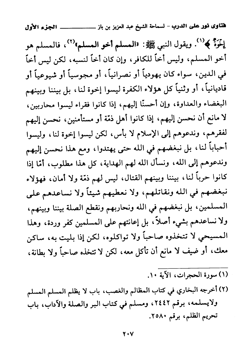 ويقول النبي صلى الله عليه وسلم: «المسلم أخو المسلم (¬1)»، فالمسلم هو أخو المسلم، وليس أخا للكافر، وإن كان أخا لنسبه، لكن ليس أخا في الدين، سواء كان يهوديا أو نصرانيا، أو مجوسيا أو شيوعيا أو قاديانيا أو وثنيا كل هؤلاء الكفرة ليسوا إخوة لنا بل بيننا وبينهم البغضاء والعداوة، وإن أحسنا إليهم، إذا كانوا فقراء ليسوا محاربين، لا مانع أن نحسن إليهم، إذا كانوا أهل ذمة أو مستأمنين، نحسن إليهم لفقرهم، وندعوهم إلى الإسلام لا بأس، لكن ليسوا إخوة لنا، وليسوا أحبابا لنا، بل نبغضهم في الله حتى يهتدوا، ومع هذا نحسن إليهم وندعوهم إلى الله، ونسأل الله لهم الهداية، كل هذا مطلوب، أما إذا كانوا حربا لنا، بيننا وبينهم القتال، ليس لهم ذمة ولا أمان، فهؤلاء نبغضهم في الله ونقاتلهم، ولا نعطيهم شيئا ولا نساعدهم على المسلمين، بل نبغضهم في الله ونحاربهم ونقطع الصلة بيننا وبينهم، ولا نساعدهم بشيء أصلا، بل إعانتهم على المسلمين كفر وردة، وهذا المسيحي لا تتخذوه صاحبا ولا تواكلوه، لكن إذا بليت به، ساكن معك، أو ضيف لا مانع أن تأكل معه، لكن لا تتخذه صاحبا ولا بطانة