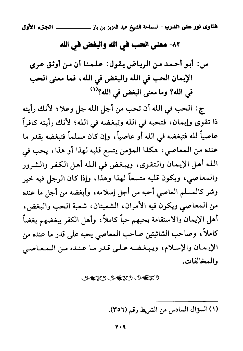 س: أبو أحمد من الرياض يقول: علمنا أن من أوثق عرى الإيمان الحب في الله والبغض في الله، فما معنى الحب في الله؟ وما معنى البغض في الله؟ (¬1)