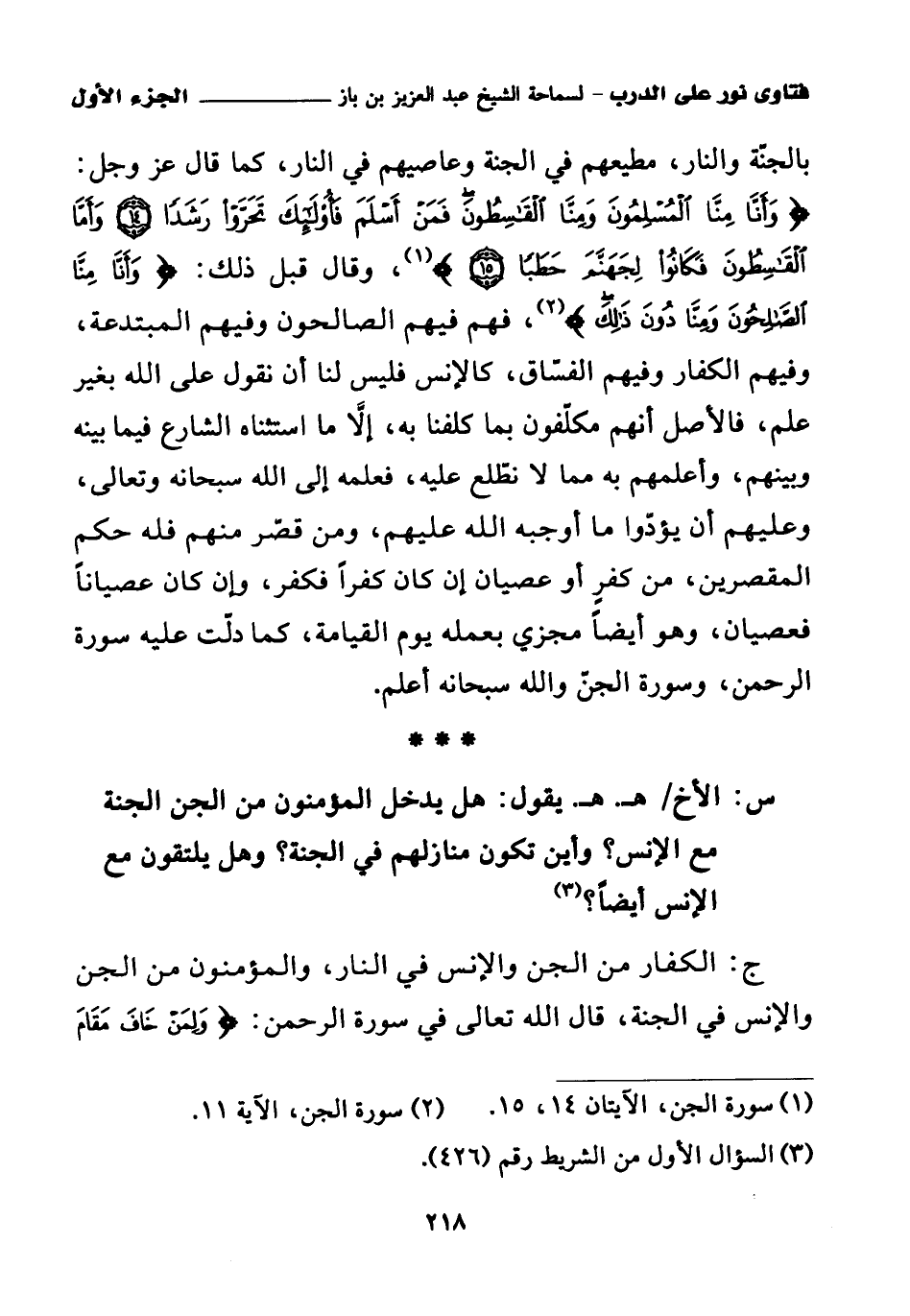 س: الأخ هـ. هـ يقول: هل يدخل المؤمنون من الجن الجنة مع الإنس؟ وأين تكون منازلهم في الجنة؛ وهل يلتقون مع الإنس أيضا؟ (¬4)
