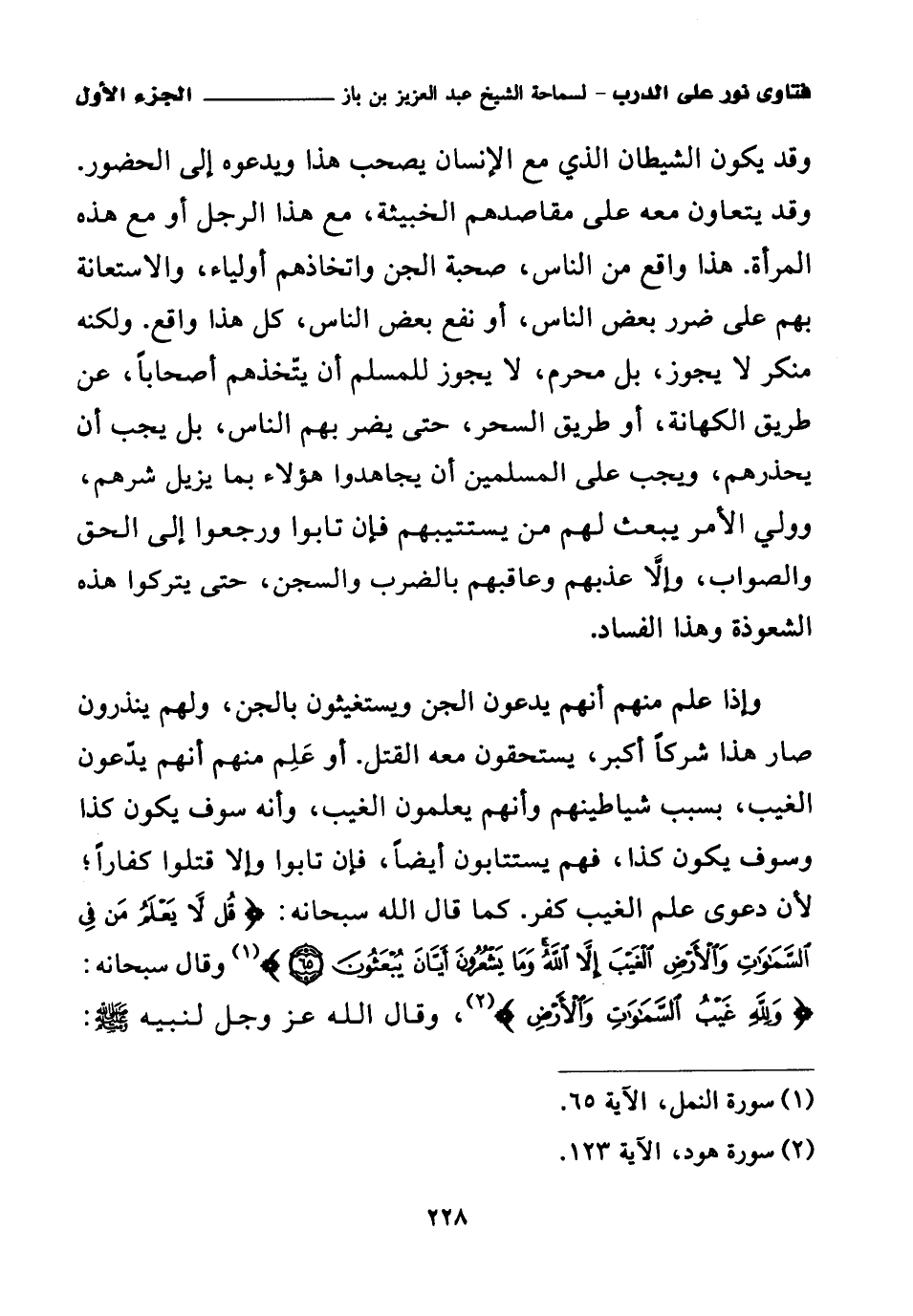 وقد يكون الشيطان الذي مع الإنسان يصحب هذا ويدعوه إلى الحضور. وقد يتعاون معه على مقاصدهم الخبيثة، مع هذا الرجل، أو مع هذه المرأة. هذا واقع من الناس، صحبة الجن واتخاذهم أولياء، والاستعانة بهم على ضرر بعض الناس، أو نفع بعض الناس، كل هذا واقع. ولكنه منكر لا يجوز، بل محرم، لا يجوز للمسلم أن يتخذهم أصحابا، من طريق الكهانة، أو طريق السحر، حتى يضر بهم الناس، بل يجب أن يحذرهم، ويجب على المسلمين أن يجاهدوا هؤلاء بما يزيل شرهم، وولي الأمر يبعث لهم من يستتيبهم فإن تابوا ورجعوا إلى الحق والصواب، وإلا عذبهم وعاقبهم بالضرب والسجن، حتى يتركوا هذه الشعوذة وهذا الفساد.