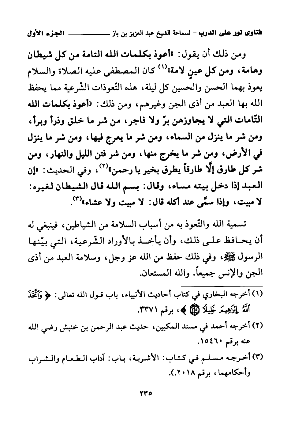 ومن ذلك أن يقول: «أعوذ بكلمات الله التامة من كل شيطان وهامة، ومن كل عين لامة (¬1)» كان المصطفى عليه الصلاة والسلام يعوذ بهما الحسن والحسين كل ليلة، هذه التعوذات الشرعية مما يحفظ الله بها العبد من أذى الجن وغيرهم، ومن ذلك: «أعوذ بكلمات الله التامات التي لا يجاوزهن بر ولا فاجر، من شر ما خلق وذرأ وبرأ، ومن شر ما ينزل من السماء، ومن شر ما يعرج فيها، ومن شر ما ينزل في الأرض، ومن شر ما يخرج منها، ومن شر فتن الليل والنهار، ومن شر كل طارق إلا طارقا يطرق بخير يا رحمن (¬2)»، وفي الحديث: «"إن العبد إذا دخل بيته مساء، وقال: بسم الله قال الشيطان لغيره: لا مبيت، وإذا سمى عند أكله قال: لا مبيت ولا عشاء (¬3)».