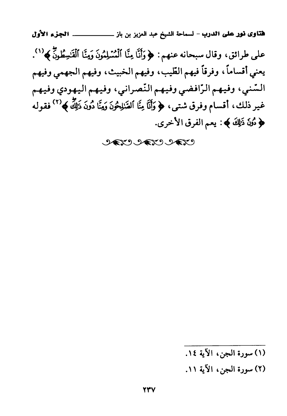 على طرائق، وقال سبحانه عنهم: {وَأَنَّا مِنَّا الْمُسْلِمُونَ وَمِنَّا الْقَاسِطُونَ} (¬1) يعني أقساما، وفرقا فيهم الطيب، وفيهم الخبيث، وفيهم الجهمي، وفيهم السني، وفيهم الرافضي، وفيهم النصراني، وفيهم اليهودي، وفيهم غير ذلك، أقسام وفرق شتى، {وَأَنَّا مِنَّا الصَّالِحُونَ وَمِنَّا دُونَ ذَلِكَ} (¬2) فقوله دون ذلك يعم الفرق الأخرى.