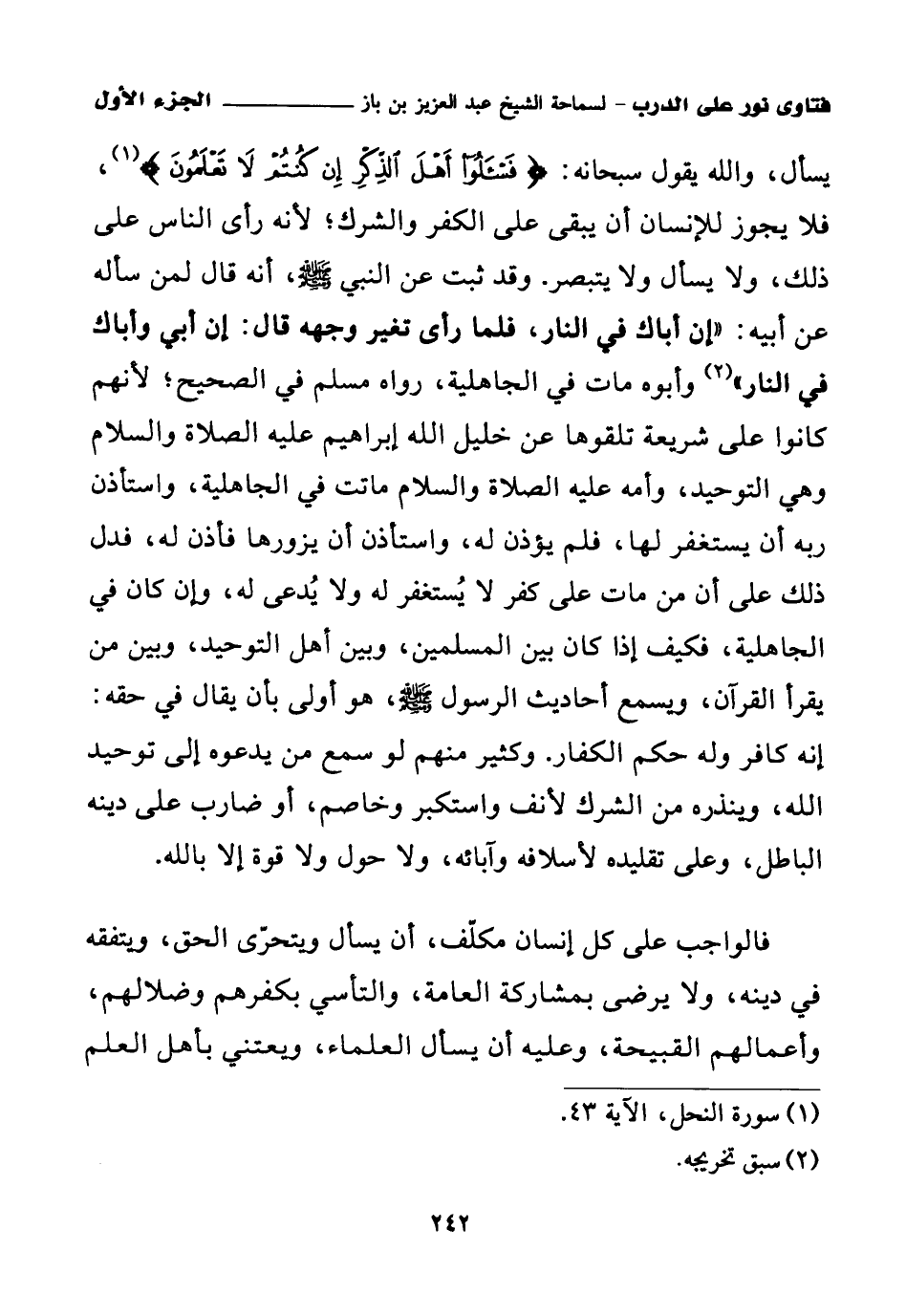 يسأل، والله يقول سبحانه: {فَاسْأَلُوا أَهْلَ الذِّكْرِ إِنْ كُنْتُمْ لَا تَعْلَمُونَ} (¬1) فلا يجوز للإنسان أن يبقى على الكفر والشرك! لأنه رأى الناس على ذلك، ولا يسأل ولا يتبصر. وقد ثبت عن النبي صلى الله عليه وسلم، أنه قال لمن سأله عن أبيه: «إن أباك في النار، فلما رأى تغير وجهه قال: إن أبي وأباك في النار (¬2)» وأبوه مات في الجاهلية، رواه مسلم في الصحيح؛ لأنهم كانوا على شريعة تلقوها عن خليل الله إبراهيم عليه الصلاة والسلام وهي التوحيد، وأمه عليه الصلاة والسلام ماتت في الجاهلية، واستأذن ربه أن يستغفر لها، فلم يؤذن له، واستأذن أن يزورها فأذن له، فدل ذلك على أن من مات على كفر لا يستغفر له ولا يدعى له، وإن كان في الجاهلية، فكيف إذا كان بين المسلمين، وبين أهل التوحيد، وبين من يقرأ القرآن، ويسمع أحاديث الرسول صلى الله عليه وسلم، هو أولى بأن يقال في حقه: إنه كافر وله حكم الكفار. وكثير منهم لو سمع من يدعوه إلى توحيد الله، وينذره من الشرك لأنف واستكبر وخاصم، أو ضارب على دينه الباطل، وعلى تقليده لأسلافه وآبائه، ولا حول ولا قوة إلا بالله.