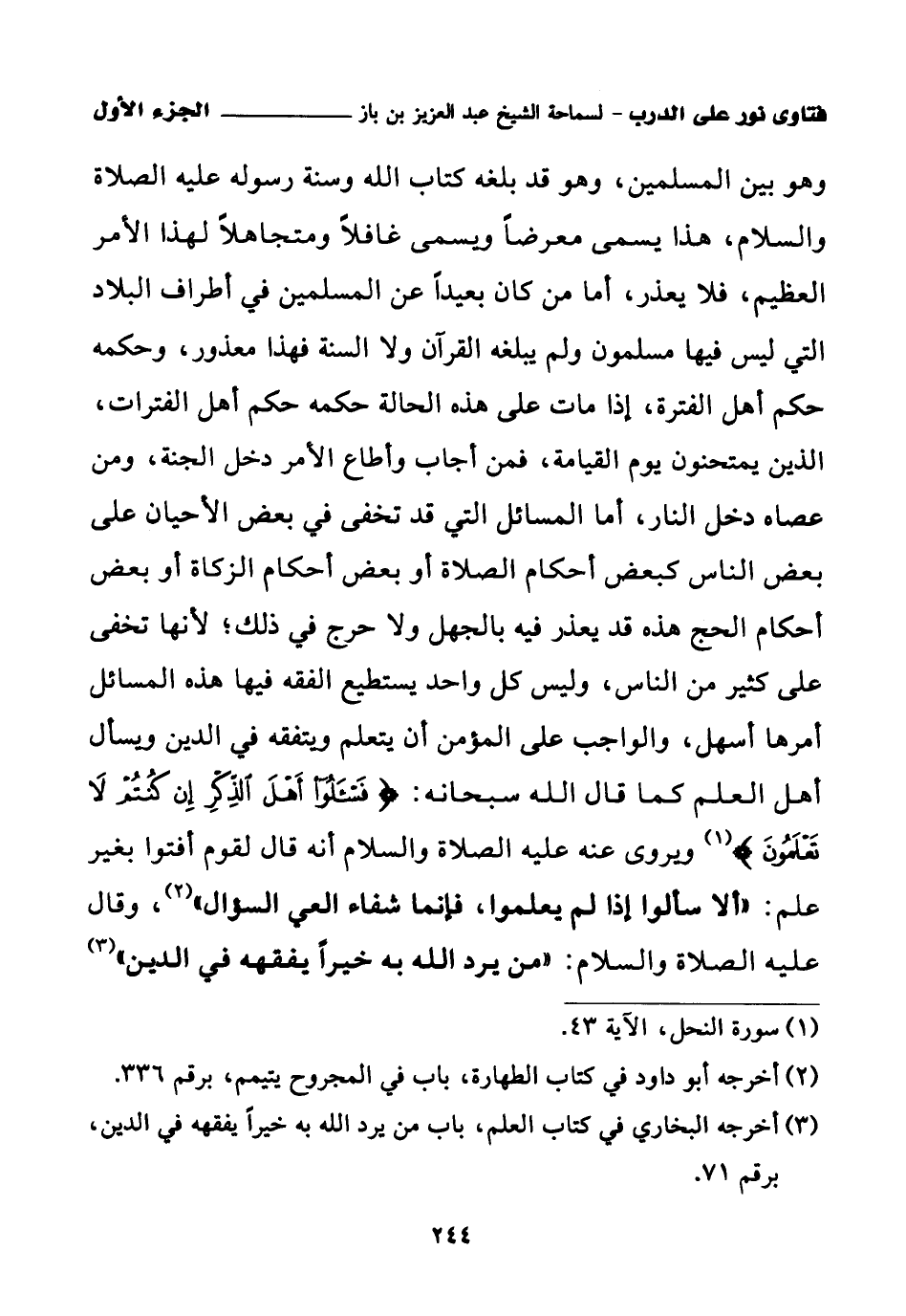 وهو بين المسلمين، وهو قد بلغه كتاب الله وسنة رسوله عليه الصلاة والسلام، هذا يسمى معرضا، ويسمى غافلا ومتجاهلا لهذا الأمر العظيم، فلا يعذر، أما من كان بعيدا عن المسلمين في أطراف البلاد التي ليس فيها مسلمون ولم يبلغه القرآن ولا السنة فهذا معذور، وحكمه حكم أهل الفترة إذا مات على هذه الحالة، حكمه حكم أهل الفترات، الذين يمتحنون يوم القيامة، فمن أجاب وأطاع الأمر دخل الجنة ومن عصاه دخل النار، أما المسائل التي قد تخفى في بعض الأحيان على بعض الناس كبعض أحكام الصلاة أو بعض أحكام الزكاة أو بعض أحكام الحج، هذه قد يعذر فيه بالجهل. ولا حرج في ذلك؛ لأنها تخفى على كثير من الناس، وليس كل واحد يستطيع الفقه فيها، هذه المسائل أمرها أسهل. والواجب على المؤمن أن يتعلم ويتفقه في الدين ويسأل أهل العلم، كما قال الله سبحانه: {فَاسْأَلُوا أَهْلَ الذِّكْرِ إِنْ كُنْتُمْ لَا تَعْلَمُونَ} (¬1) ويروى عنه عليه الصلاة والسلام أنه قال لقوم أفتوا بغير علم: «ألا سألوا إذ لم يعلموا فإنما شفاء العي السؤال (¬2)»، وقال عليه الصلاة والسلام: «من يرد الله به خيرا يفقهه في الدين (¬3)».